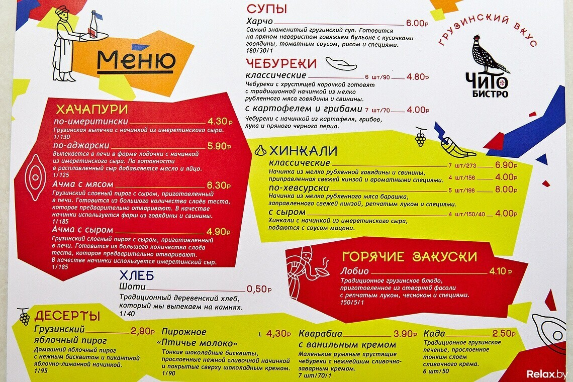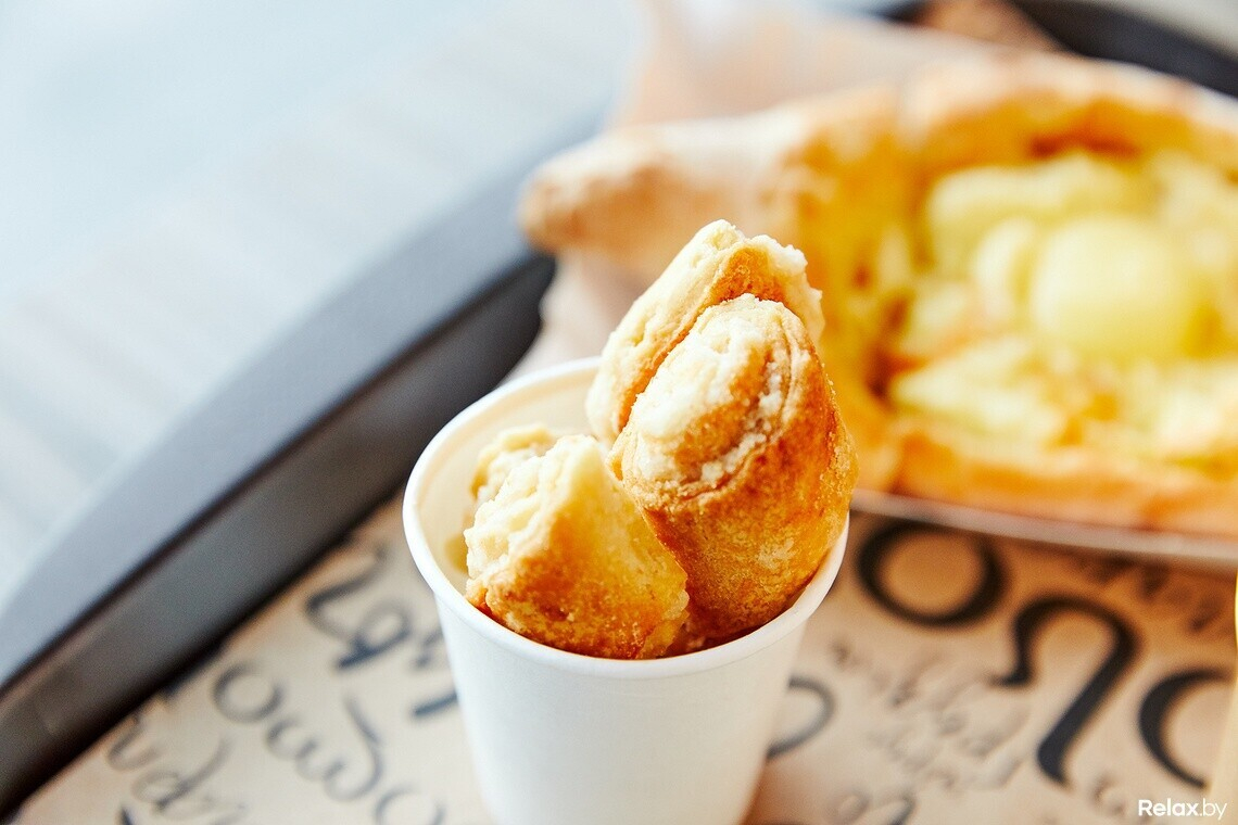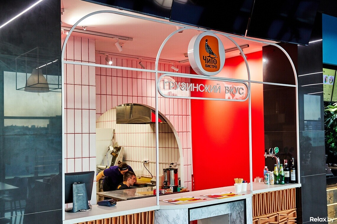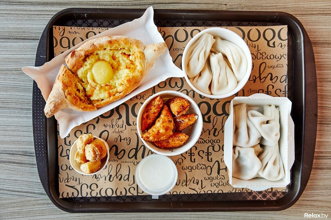 Место на фуд-корте — еще одна точка масштабирования для этой сети. Отметим открытую кухню: все процессы здесь на виду, можно наблюдать, как повара раскатывают тесто для хачапури или хинкали. Меню получилось емким, но, на наш взгляд, удачным: заказать можно самые популярные блюда грузинской кухни. Два вида хачапури — по-аджарски и по-имеретински. Выход хачапури меньше, чем в ресторане, поэтому при заказе на двоих может быть мало. Хинкали поштучно здесь не продают, но, например, классические можно купить в двух вариантах порций — 4 или 7 штук.