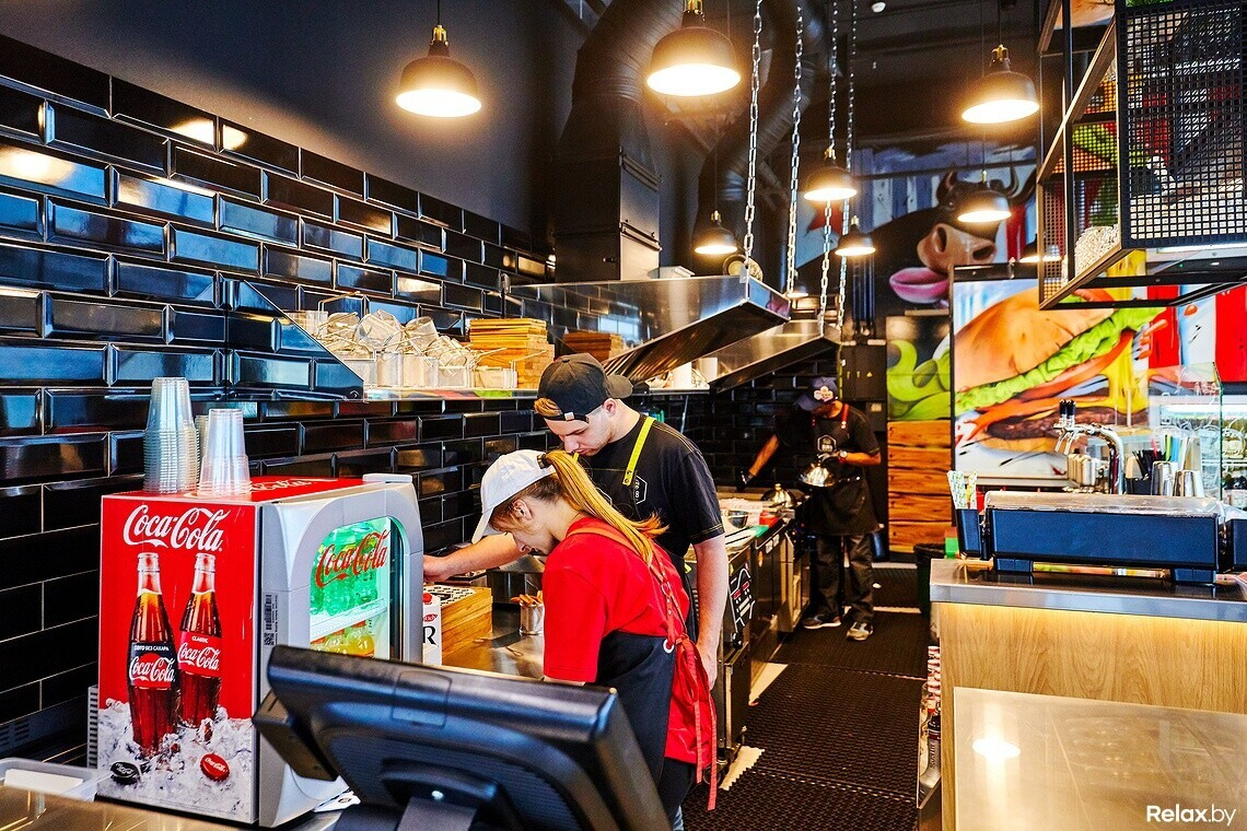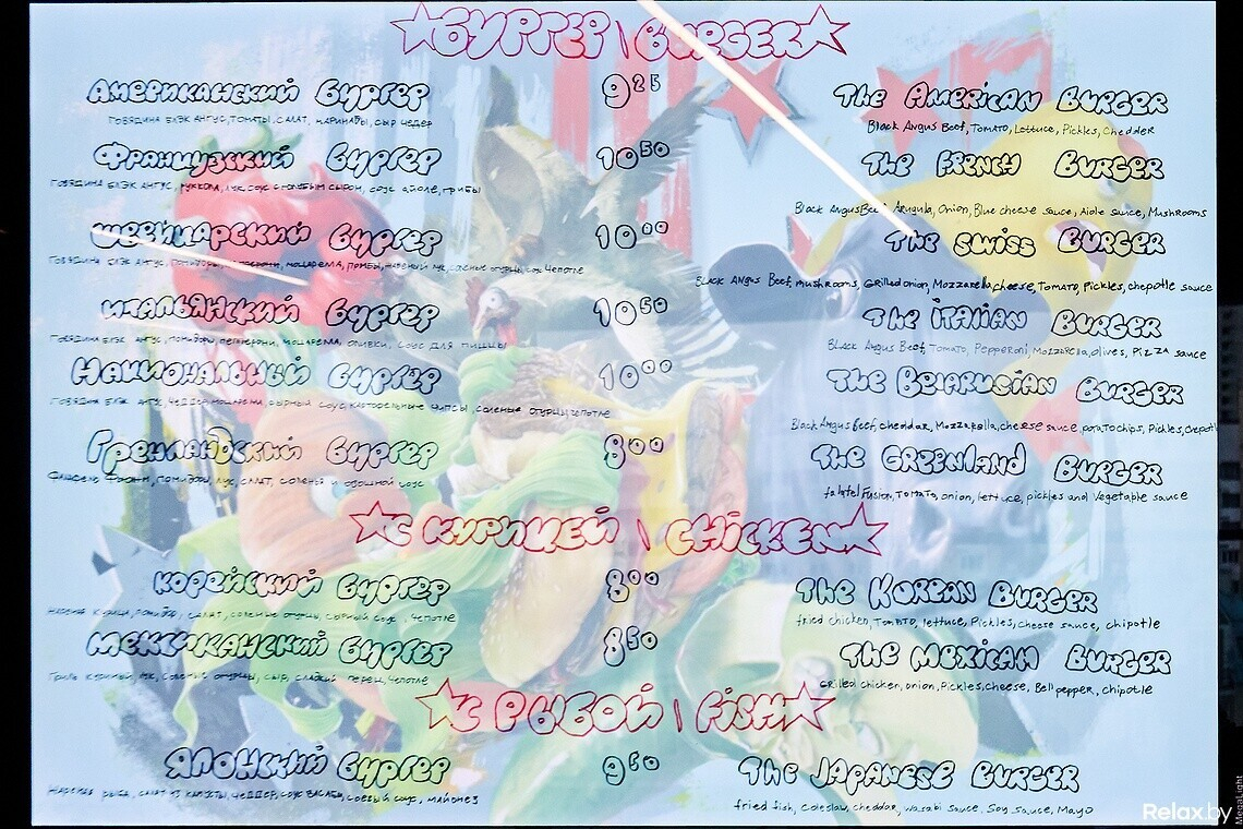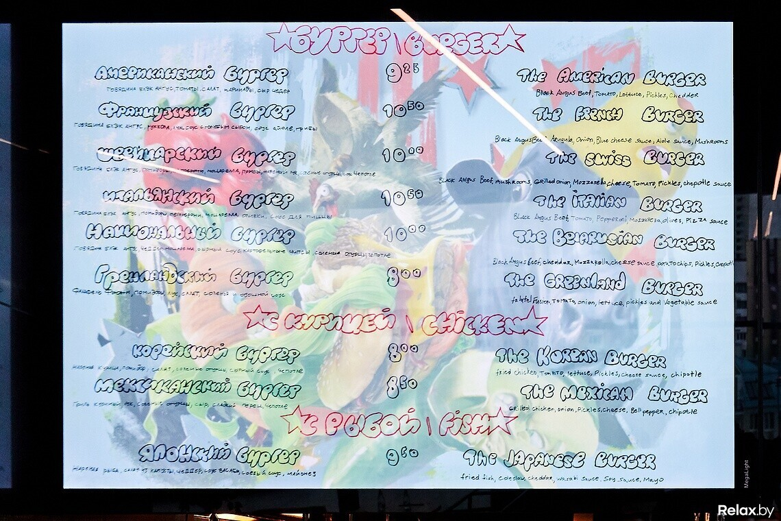 При заказе на фуд-корте сотрудники подчеркивают: с «заморозкой» здесь не работают, фарш в заведение приходит свежий. Мясо для котлет — Black Angus от Bon Food (онлайн-маркета фермерских продуктов). В меню 9 видов бургеров, есть позиции с говядиной, рыбой, курицей. Названия попытались подчеркнуть ингредиентами: например, в «Итальянском» бургере найдете моцареллу, пепперони и оливки, а в «Японском» — васаби и соевый соус. К бургеру можно заказать сырные шарики или крафтовый картофель фри (из белорусской картошки).