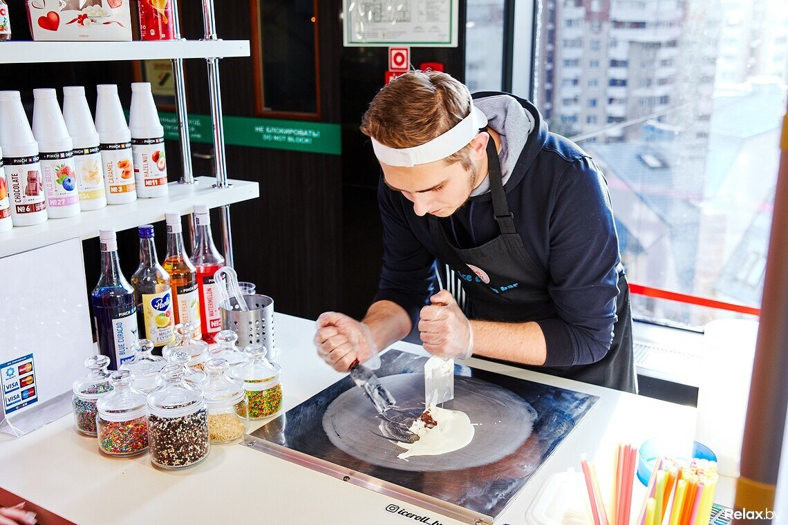 — Почему мороженое называют жареным? Потому что процесс приготовления похож на жарку. Грубо говоря, мы жарим на холоде. Температура в середине панели, на которой я работаю, — минус 35 градусов. Смешиваем фрукты, ягоды, шоколадную пасту либо конфеты с молочной основой и при вас формируем «роллы». Вафля, топпинг и посыпка включены в стоимость.