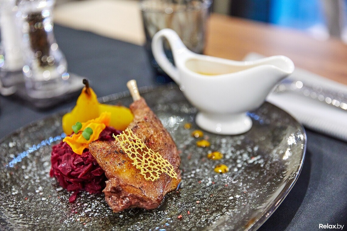 Меню получилось космополитичным, с легким акцентом на морепродукты и явным упором на сочетание с вином. К последнему шеф-повар рекомендует заказать ассорти из мини-брускетт или голубые мидии в сливочно-сырном соусе. Из основных блюд — утиную ножку с пьяной грушей или дорадо, запеченную в соли с голландским соусом.