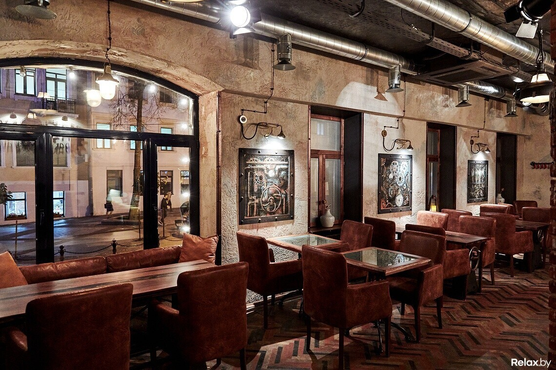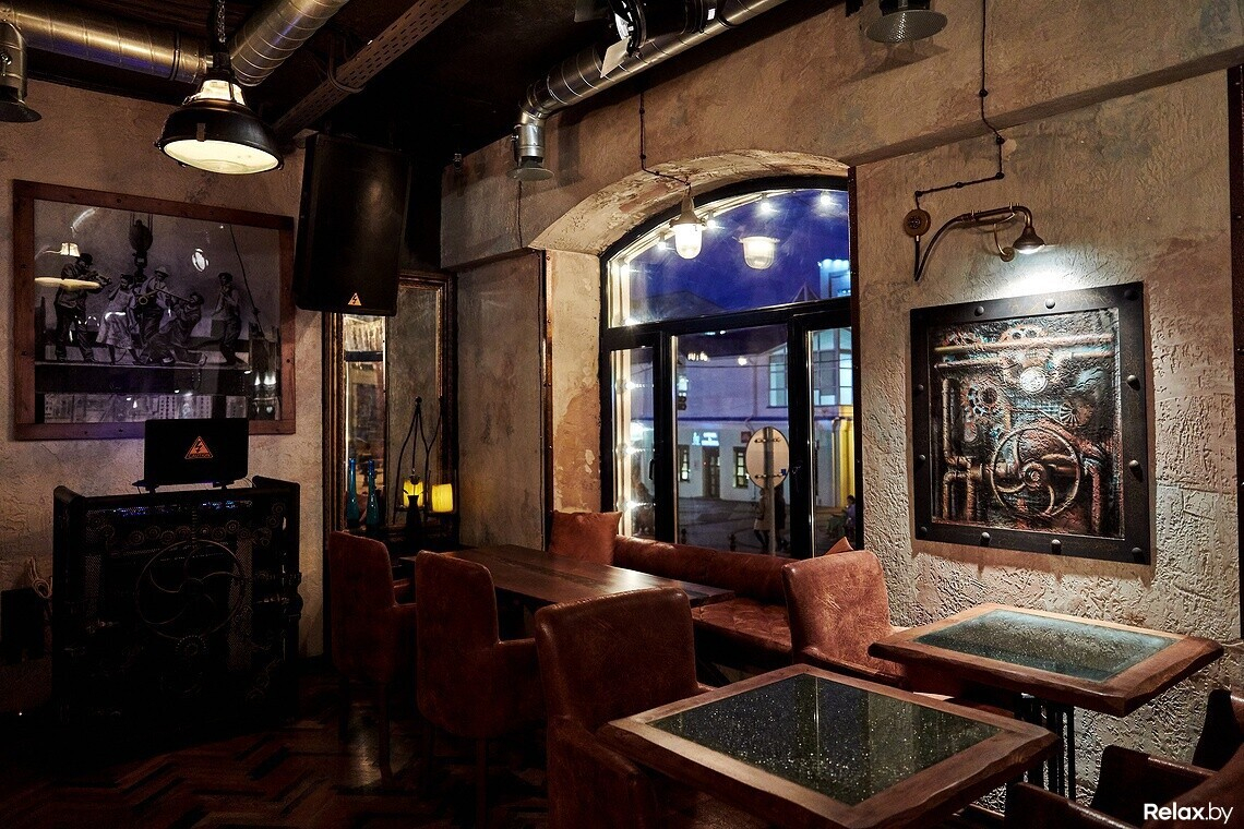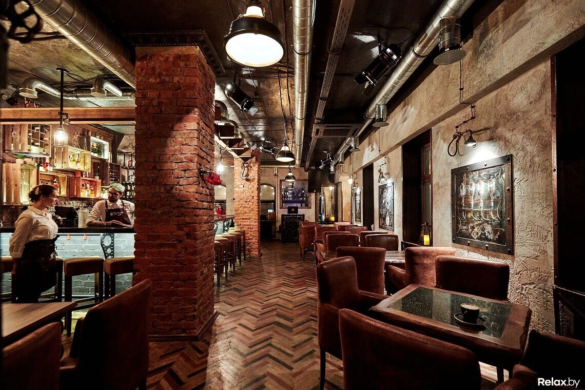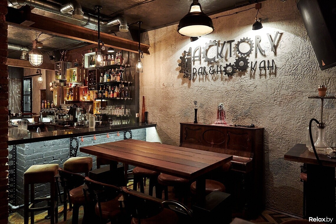 «Фэктори бар» вдохновлен первыми тремя десятилетиями прошлого века в США. Атмосферу «сухого закона» здесь буквально собирали по крупицам, многие вещи создавались вручную белорусскими мастерами. В интерьере много антиквариата, кожи, дерева, металла.
