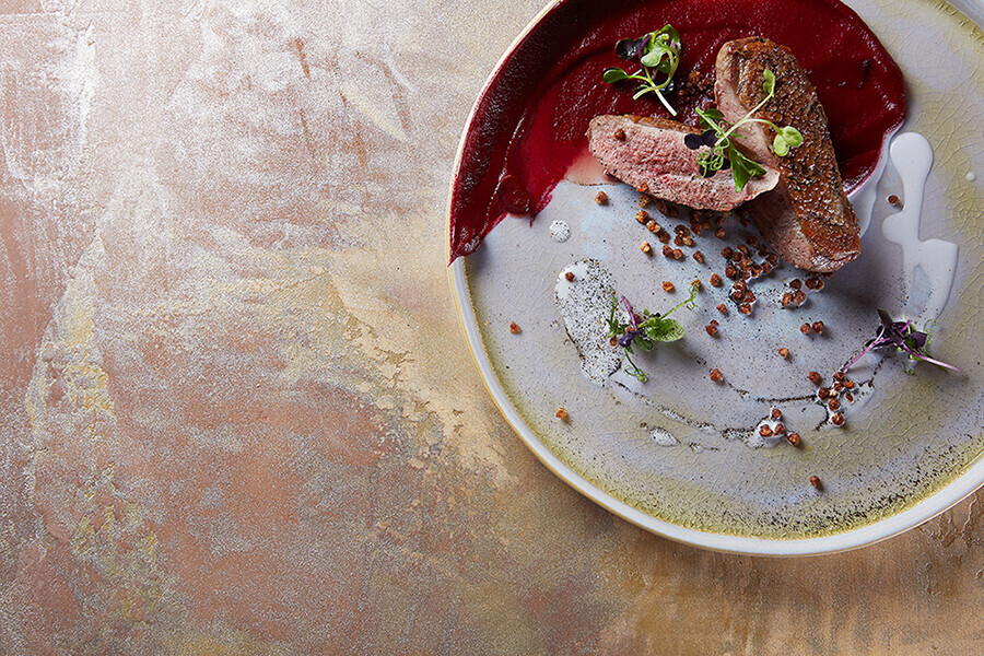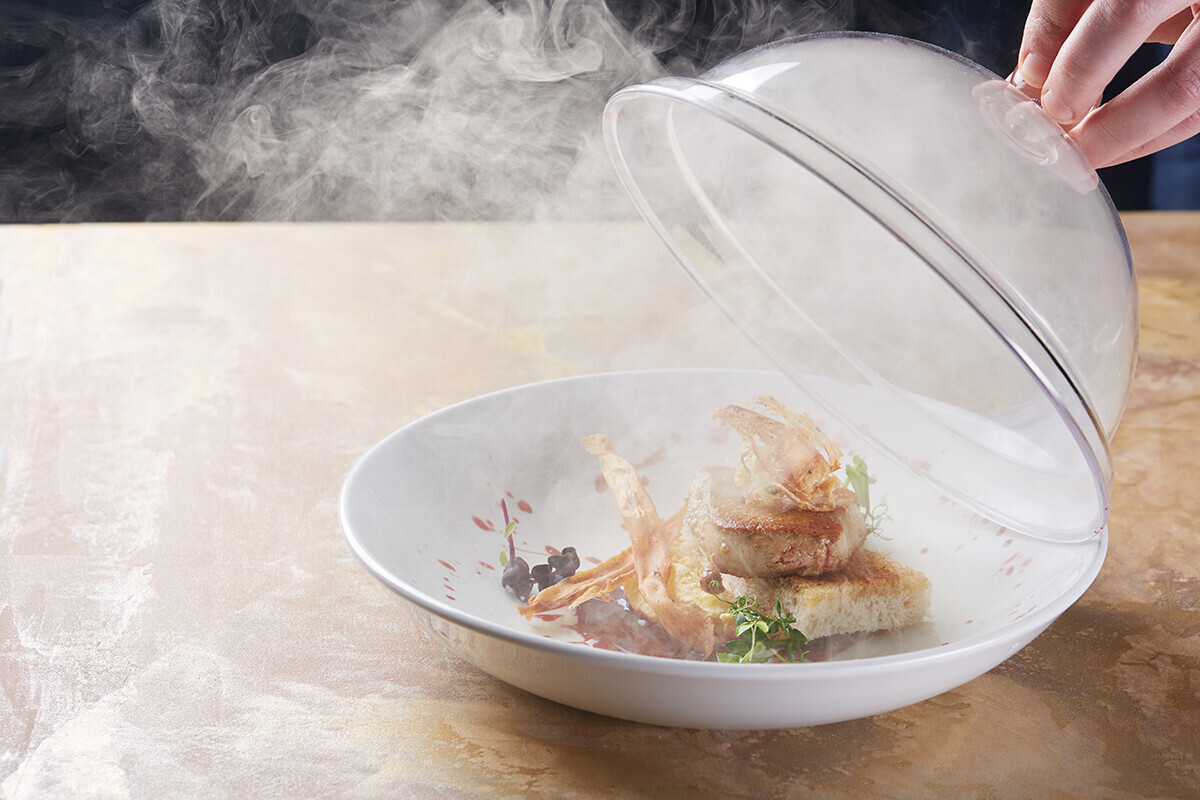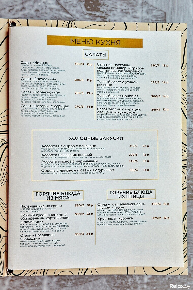 В меню шеф-повар сосредоточился на средиземноморской кухне. Из топовых позиций он рекомендует попробовать пять текстур томата с сыром буррата — 30 рублей, утиное магре со свекольным пюре — 31 рублей, фуа-гра с копченым дымом — 30 рублей, тыквенный суп-капучино с кокосовой пеной и кофе — 10 рублей. В специальном предложении можно найти тигровые креветки (21 рубль), камчатского краба (69 рублей), лобстер (30 рублей) и осьминога (25 рублей). Названные морепродукты шеф-повар приготовит, выслушав пожелания гостя.