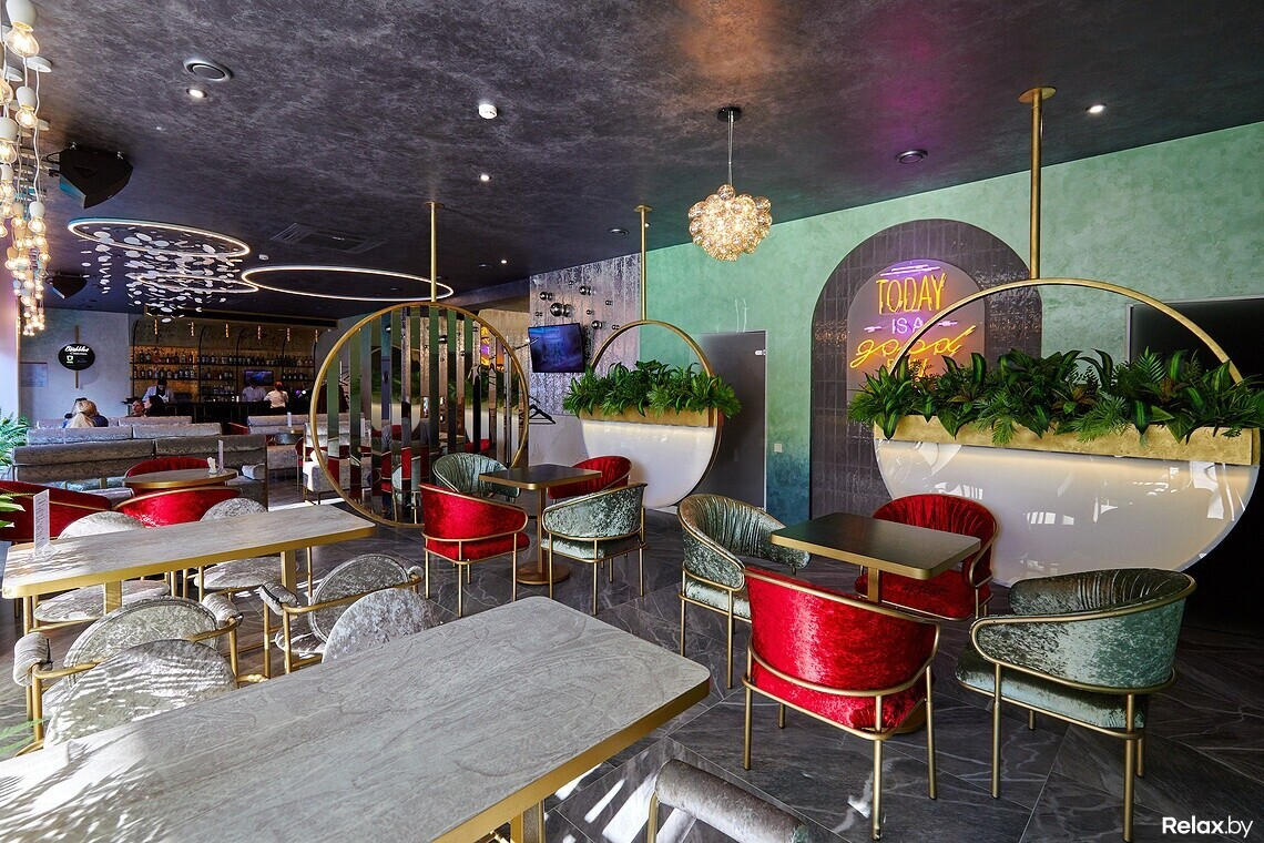 Одно из ключевых решений в интерьере — витринные окна и много натурального света. Днем зал кафе отлично просматривается с улицы. Цветовое решение с большего спокойное, яркие вкрапления — мебель в цвете марсала. И, конечно, много неона: вечером заведение кардинально преображается.