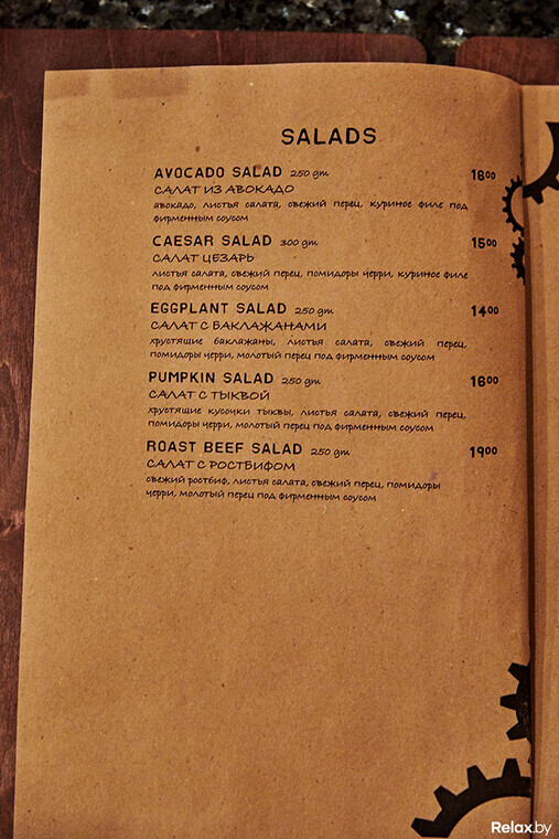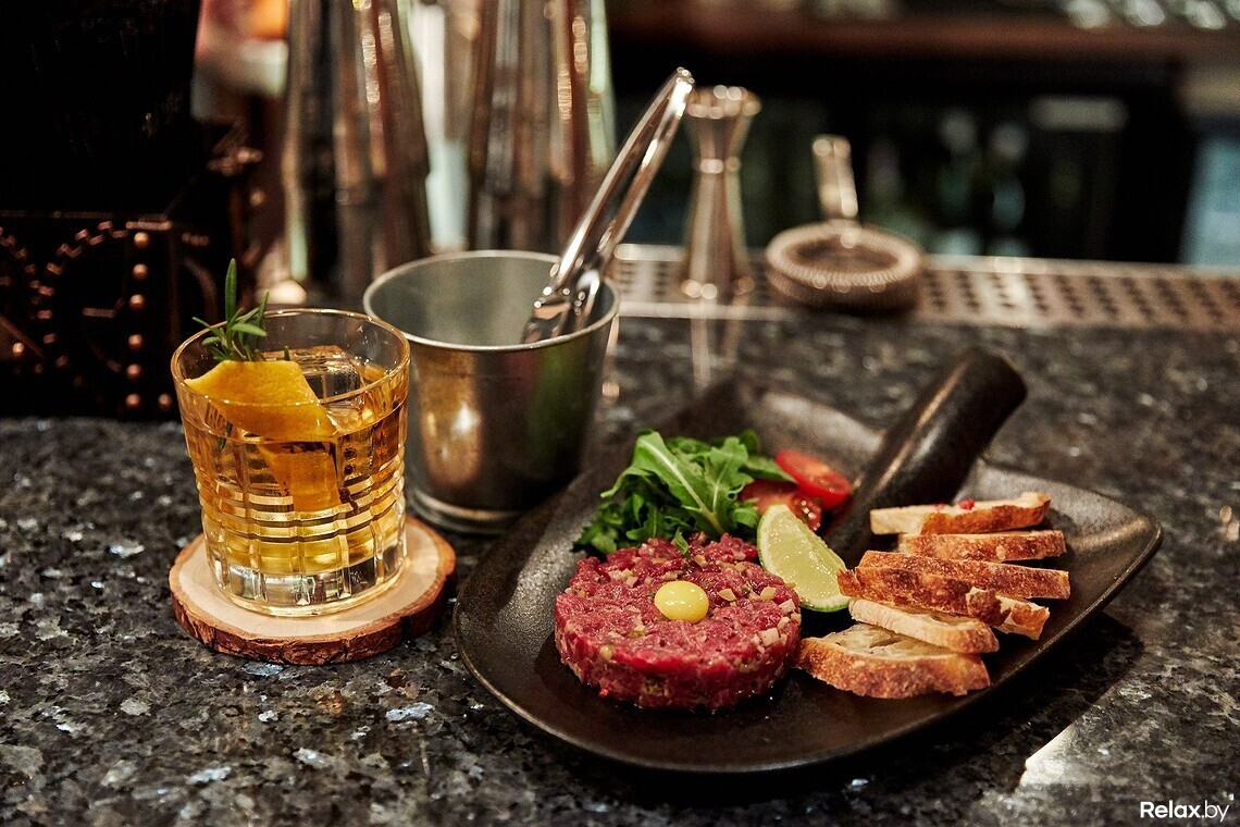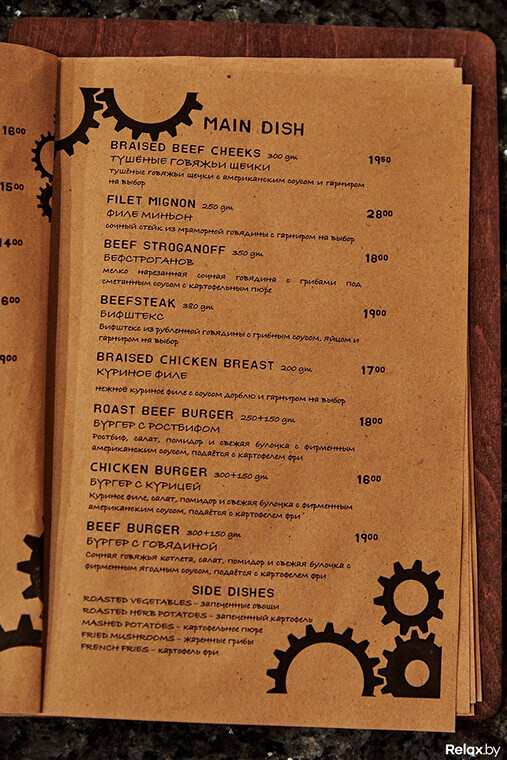 На кухне вполне ожидаемо готовят стейки. Еду здесь называют «американской»: минимум рыбы, максимум мяса, сытные порции и понятные рецептуры. Можно попробовать тартар из говядины за 14 рублей, салат с ростбифом за 19 рублей, бургер с говядиной за 19 рублей или бефстроганов за 18 рублей.