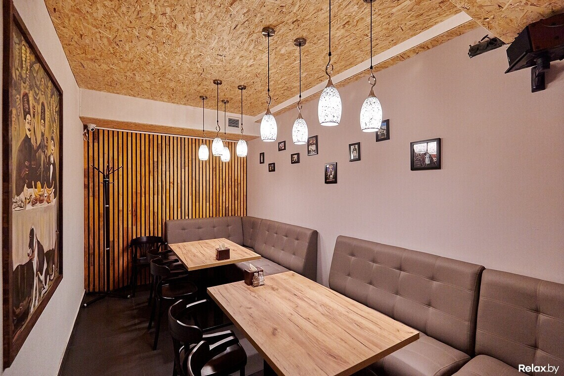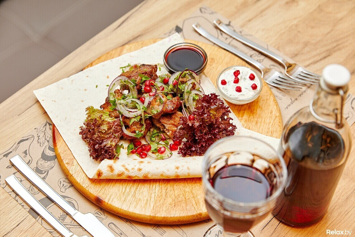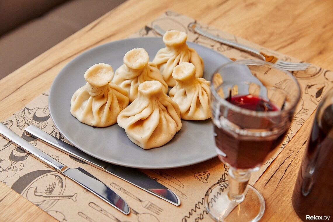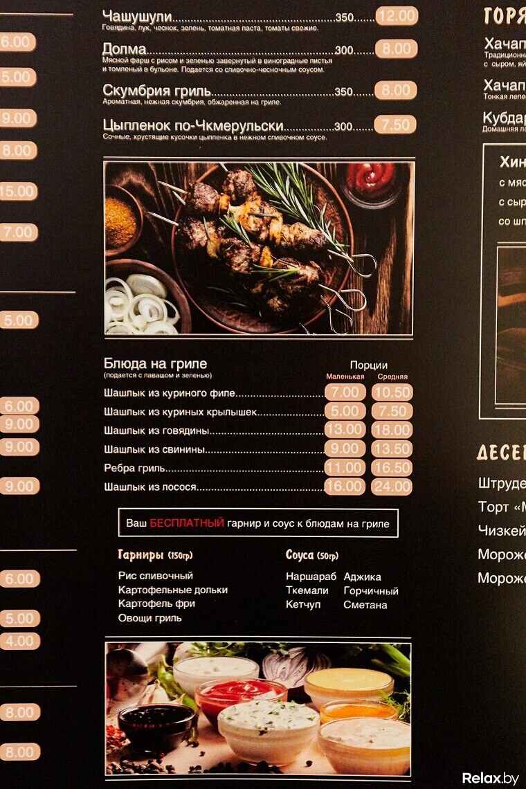 Шеф-повар «Гамарджоба» Артем Огризко работал в Грузии, стажировался в Москве и Питере. В емком меню представлены блюда в разных категориях: свинина, говядина, курица, рыба. Команда решила не углубляться и представить стандартную грузинскую классику — хинкали, хачапури, шашлык, чахохбили и другое. Если заказываете блюдо на гриле, то соус и гарнир на выбор получаете бесплатно (экономия около 2,5-3 рублей). В барном меню есть домашнее вино, чача и авторские коктейли на ее основе.