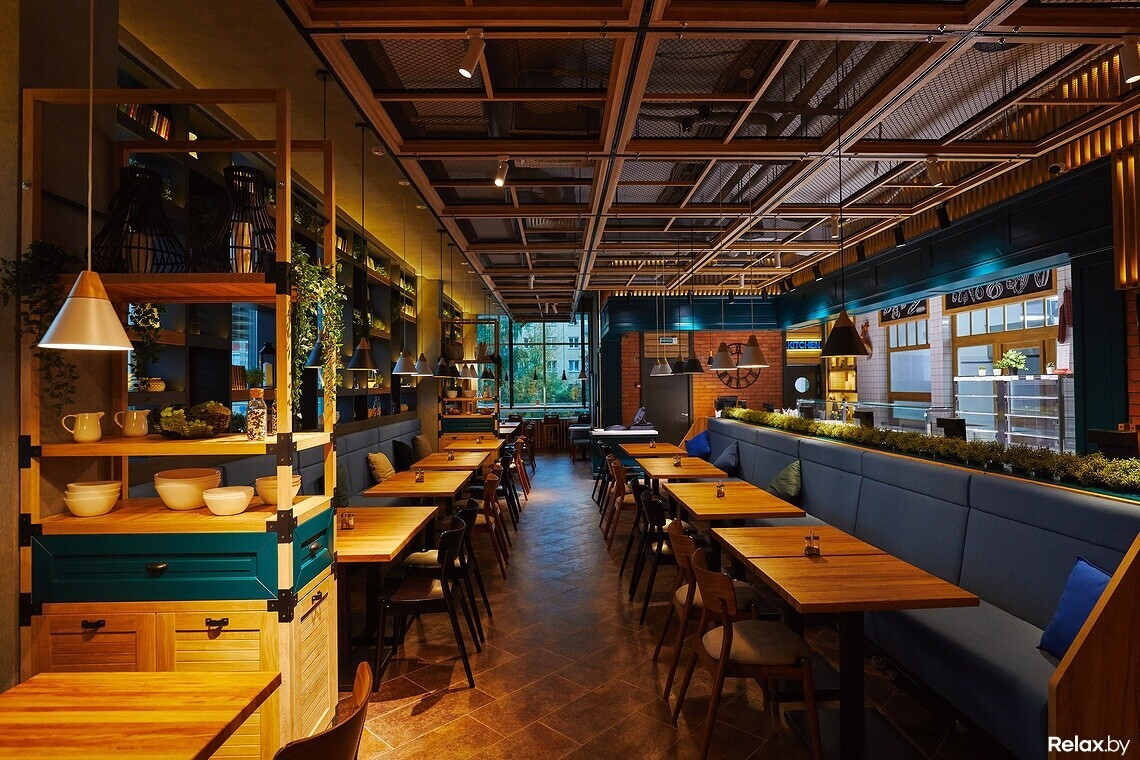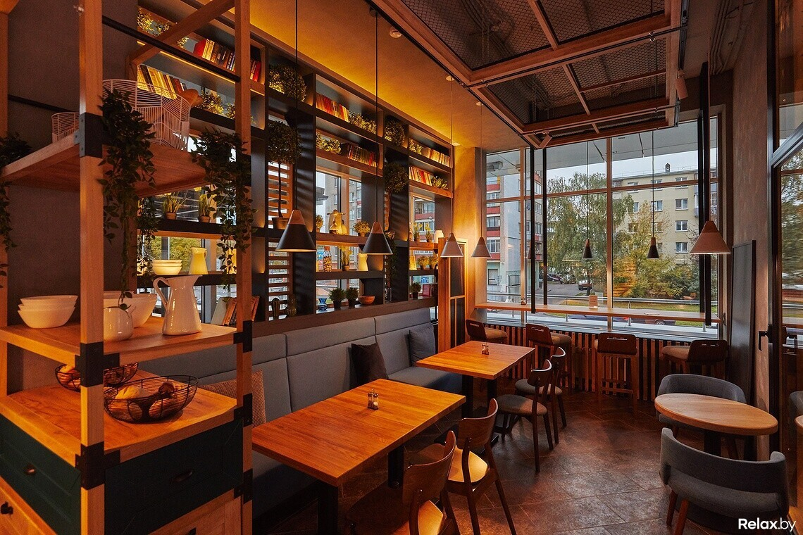 Достойный пример того, как может выглядеть заведение в спальном районе. Над интерьером работала команда INSIGHT STUDIO, ребята известны по проектам «Пересмешник», «Винный шкаф», Ayahuasca Social Club. Меню получилось понятным и не побоимся этой формулировки — доступным. Средняя цена за горячее блюдо не превышает 20 рублей. Дороже всего обойдутся стейки от шефа — 25 рублей. Но чаще всего сюда приходят за пастой и выпечкой. Последнюю, к слову, готовят на месте: цены стартуют от 3 рублей.