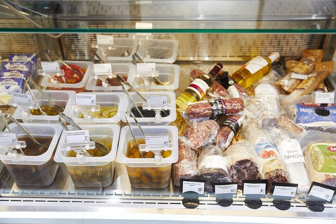 На витрине вы насчитаете несколько десятков сыров. Помимо итальянских, немецких, французских, испанских, польских, литовских, швейцарских и голландских, можно заметить сыры из Сербии, Ирана. Если любите эксклюзив, обратите внимание на традиционный бальзамический уксус Leonardi и фаршированные оливки греческой торговой марки Mylos Plus.