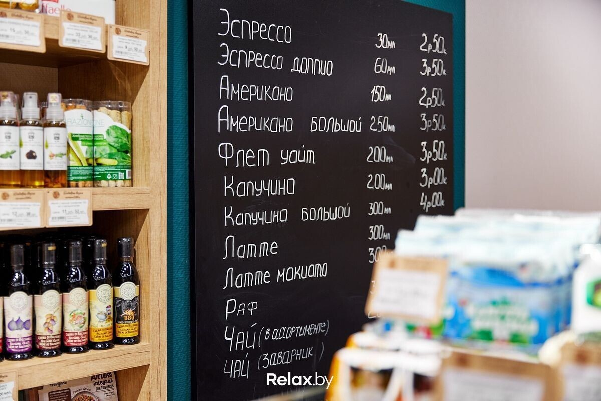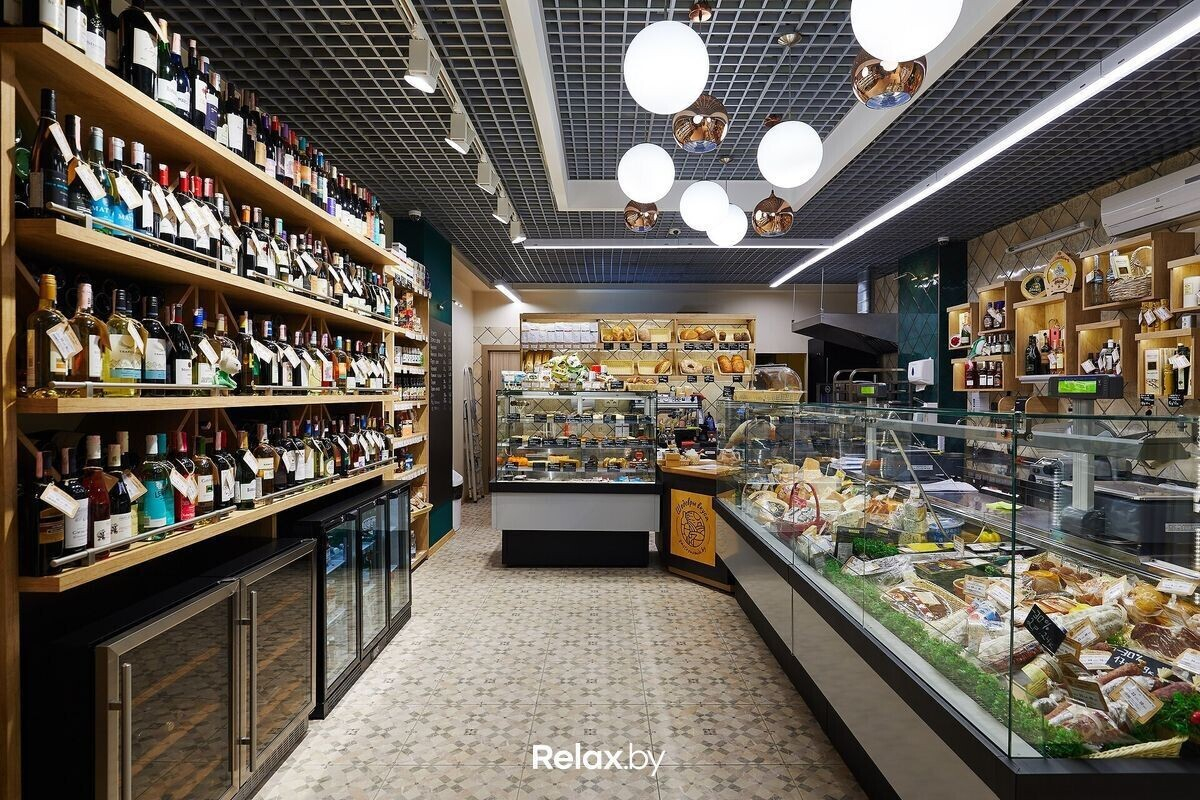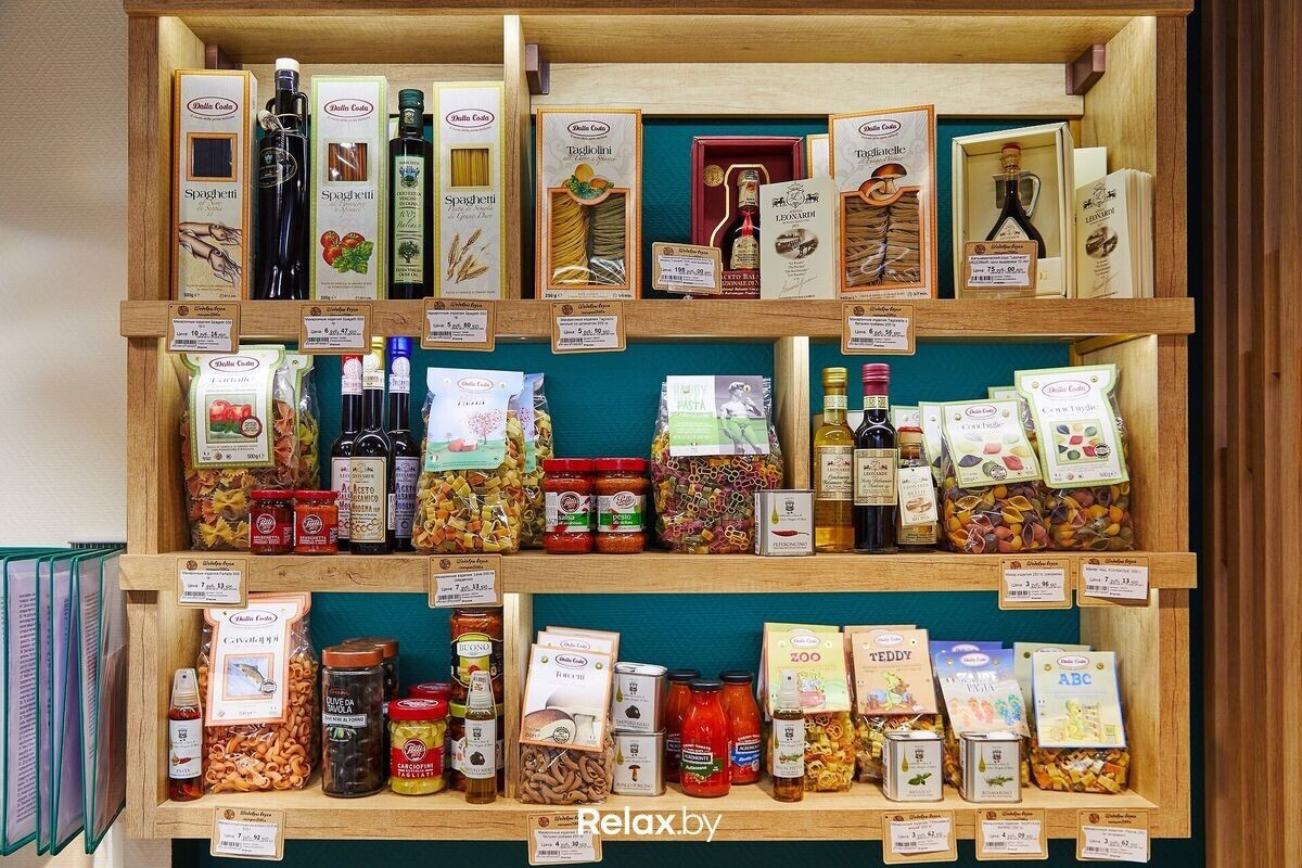 На полках в зоне магазина можно найти пасту, рис, мюсли, специи, оливки, трюфель, оливковое масло, протертые томаты, хумус и другое. Неплохой выбор сыров и мясных деликатесов. Круассаны и хлеб (в том числе итальянский) выпекают на месте. География стран-производителей широкая: от Италии и Франции до Чили, Бразилии, Перу, Беларуси. Цены на вино стартуют от 16 рублей. Пробкового сбора в «Прошуттерии» нет.