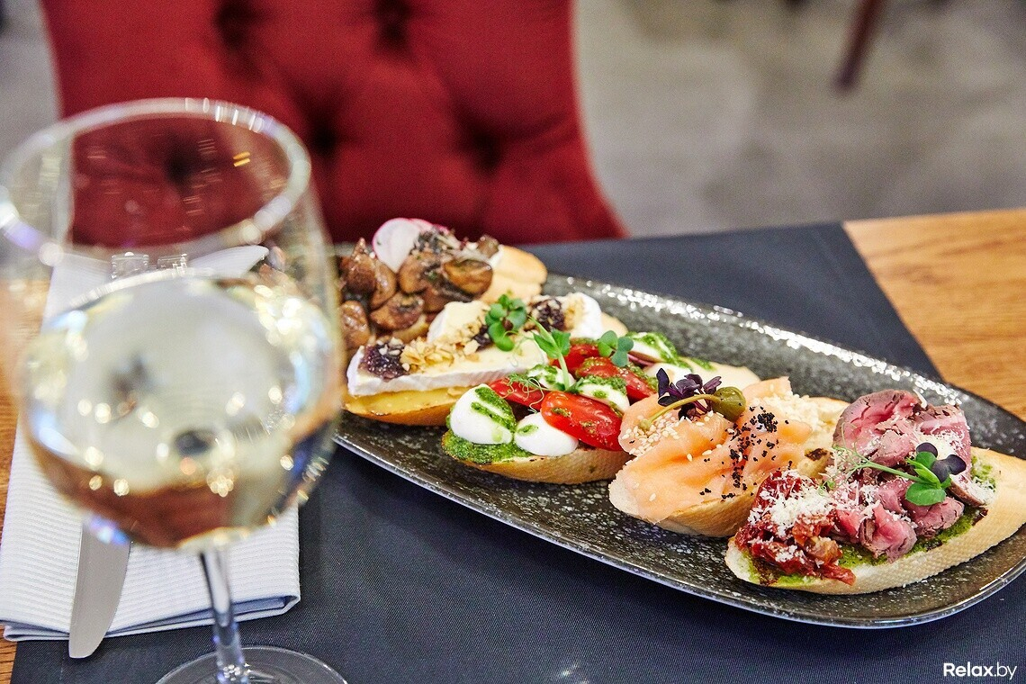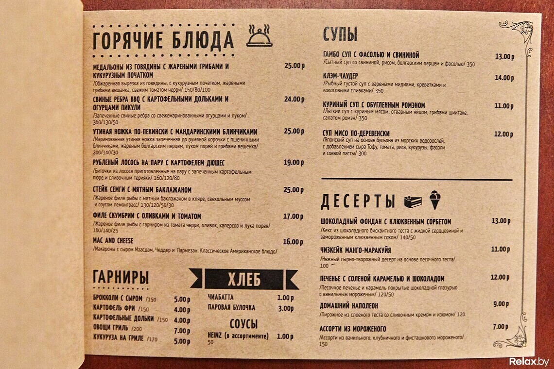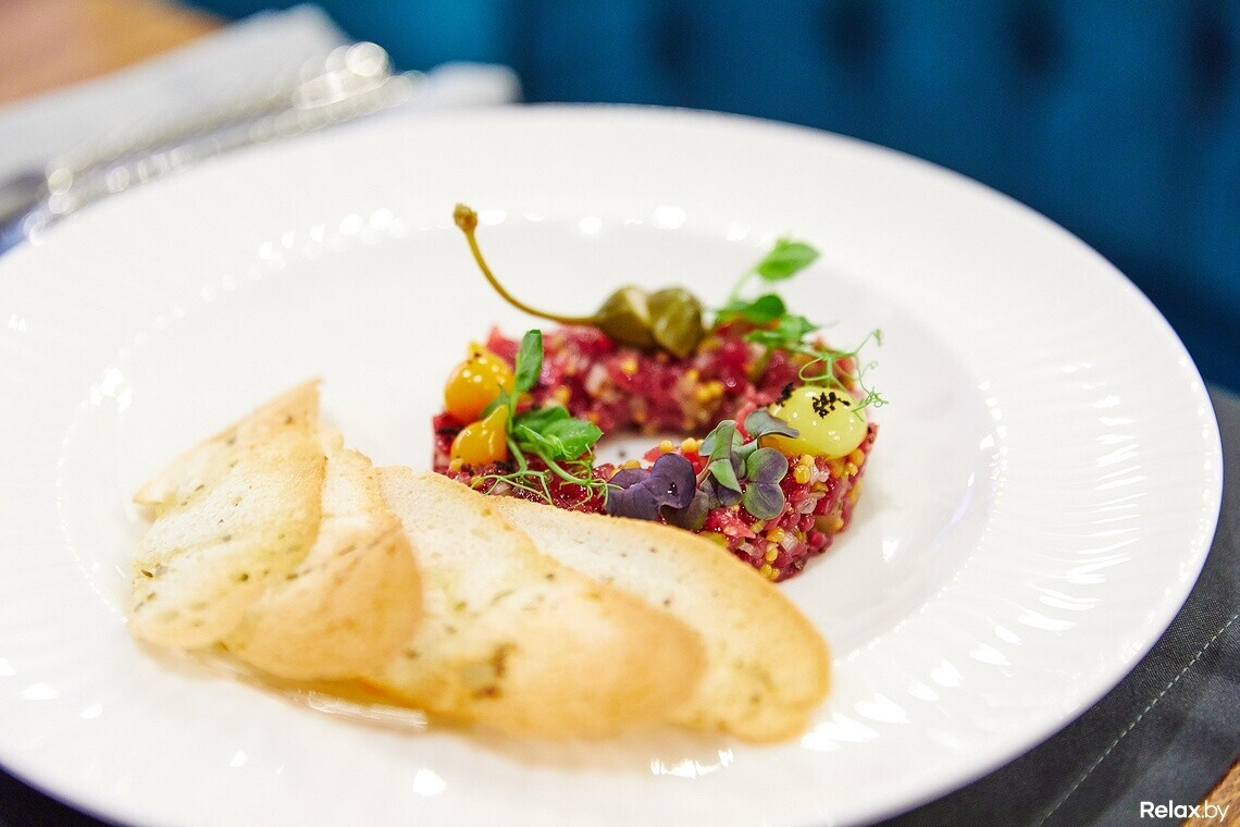 Вот некоторые позиции из меню: тартар из лосося с авокадо (15 руб.), тартар из говядины (13,5 руб.), карпаччо из говядины (13 руб.), винный сет (20 руб.), салат из говяжьего языка с фунчозой (10 руб.), салат с ростбифом и вялеными томатами (13 руб.), салат из свеклы с рукколой, сыром «Моцарелла» и кедровыми орешками (9 руб.), стейк из лосося с пюре из зеленого горошка с мятой (21 руб.), дорадо, запеченная в соли с соусом «Голландез» (24 руб.), утиная ножка «Конфи» с пьяной грушей (20 руб.), куриное филе с овощами в сладко-остром соусе (13 руб.).