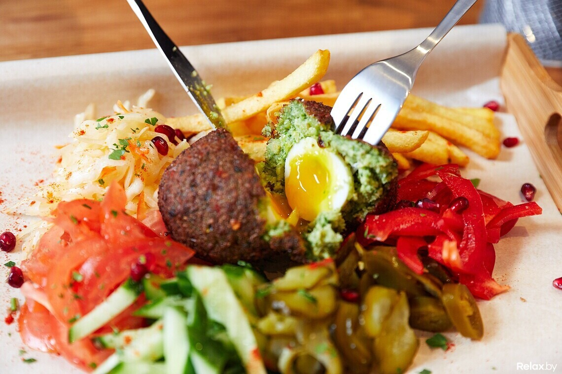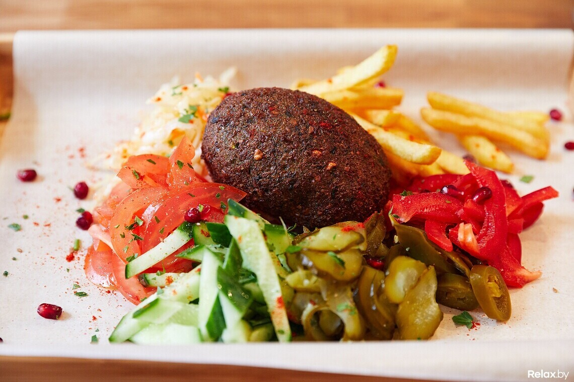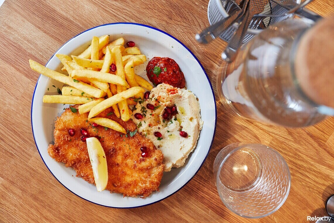 — Из новинок — куриный шницель, — рассказывает Валерия. — Это любопытная израильская вариация традиционного венского шницеля. Также отмечу араис — основное блюдо, которое готовят из мясного фарша со специями. Фарш выкладывается в питу и обжаривается на гриле. Подаем с картофелем фри, матбухой и острым соусом хариссой.