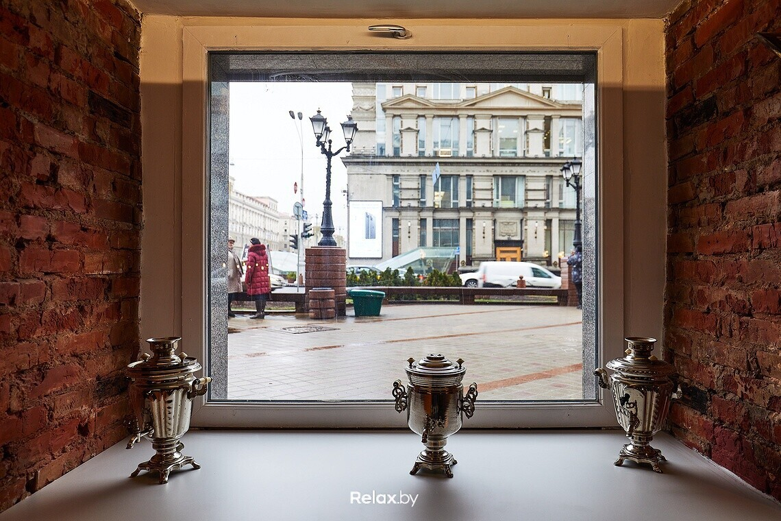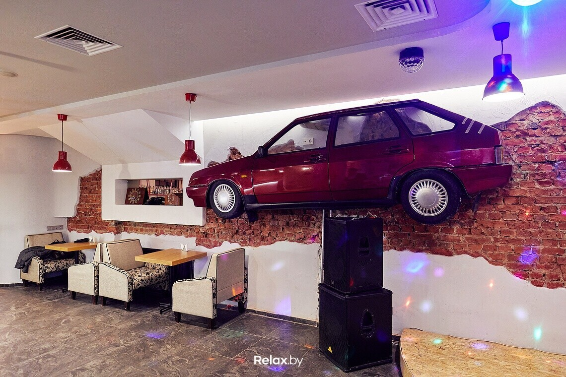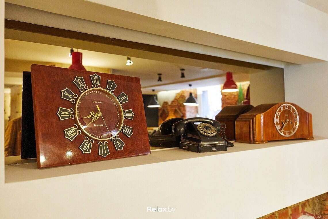 В залах много трогательных артефактов, которые искали на барахолках и в частных коллекциях. Ретролампы, плакаты Кремля, старые модные журналы, бабушкины комнатные растения, отрывные календари, старые проводные телефоны, ковры и многое другое. Центральный элемент — вишневая «девятка» в основном зале на 100 посадок, которую после долгих поисков специально для заведения восстановили и покрасили.