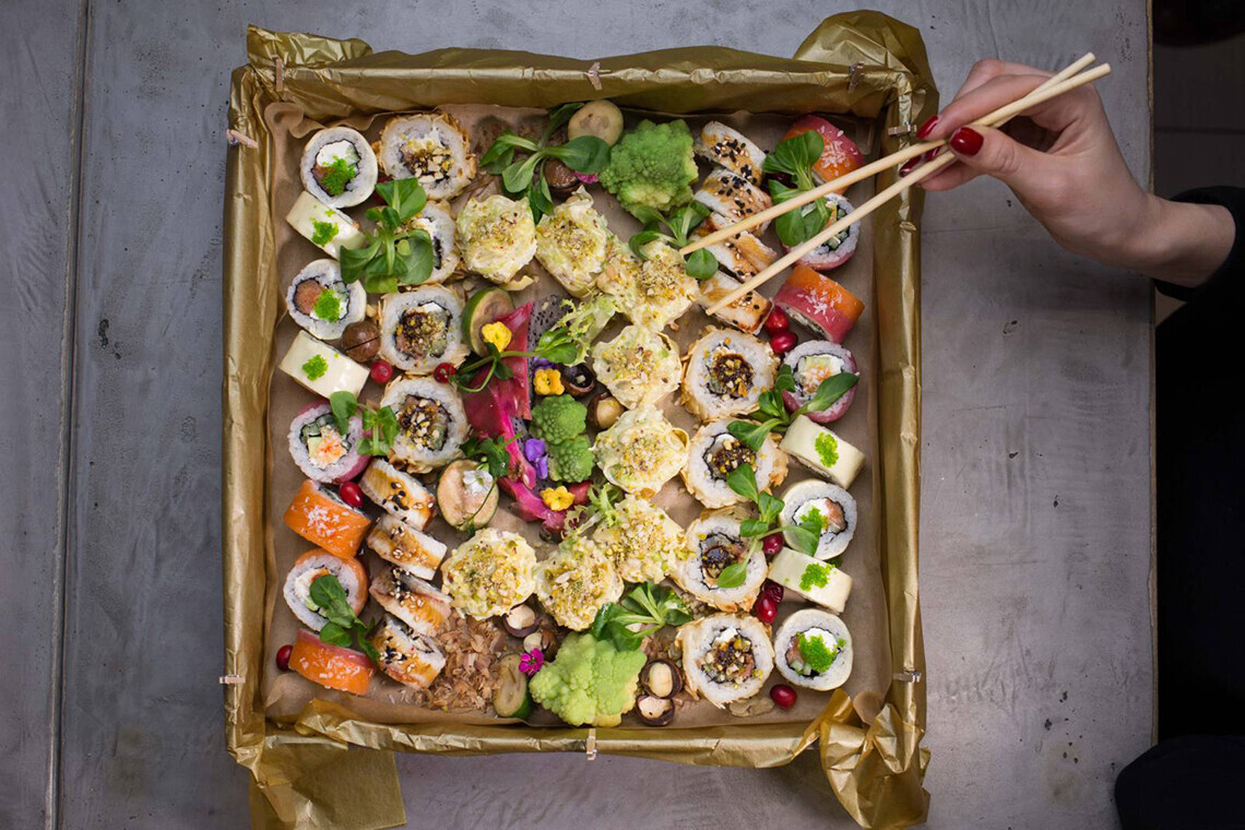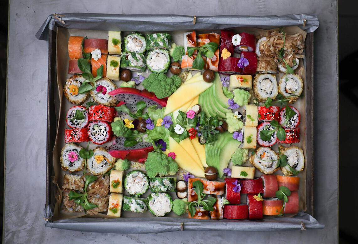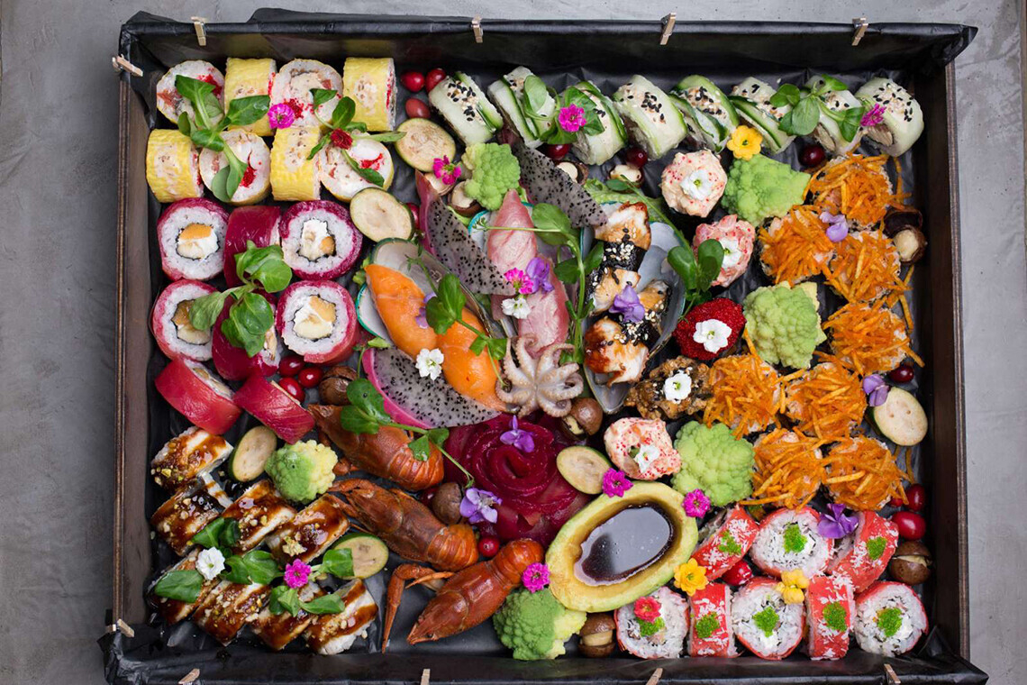 У каждого подноса — своя специфика. А один-два сета в сезон будут стабильно обновляться. В качестве оформления будут использоваться сезонные продукты, ягоды, микрозелень, раки. Кстати, почти все, что вы получите на подносе, помимо роллов, можно смело есть. Исключением будут лишь сухоцветы: например, сушеный лотос.