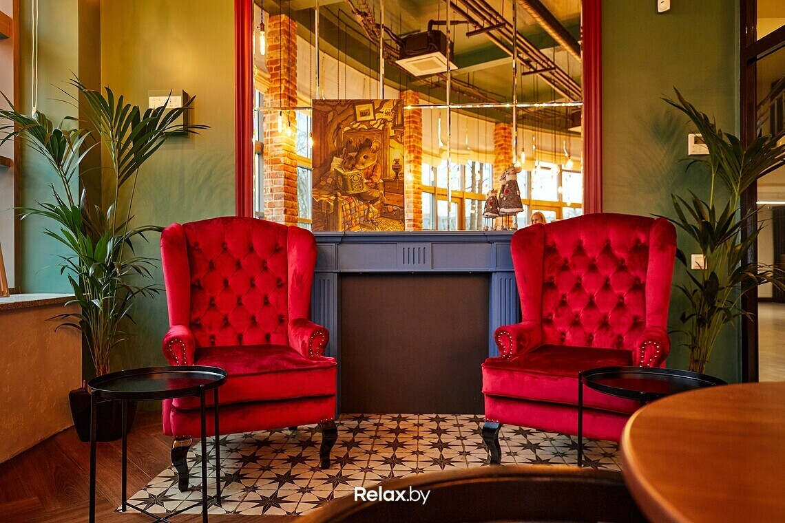 В CoffeeMouse 12 посадочных мест. Акцентно в интерьере выглядят зеркало над имитацией камина и бордовые глубокие кресла в английском стиле.