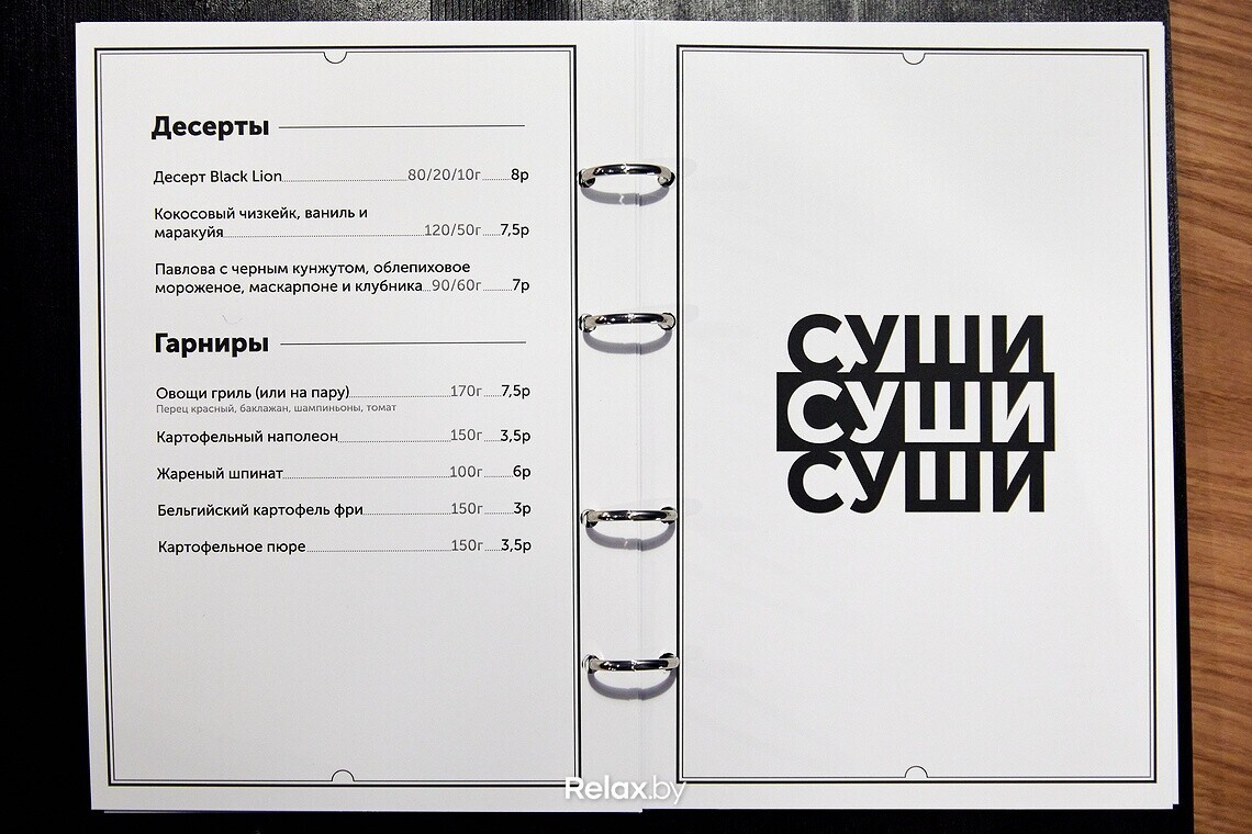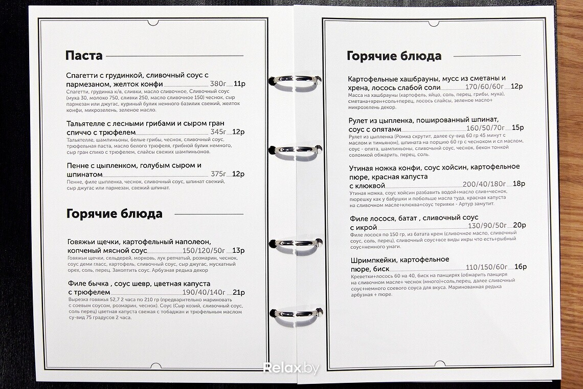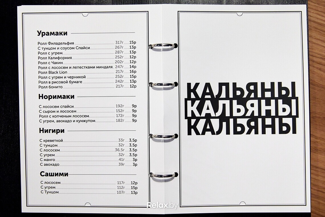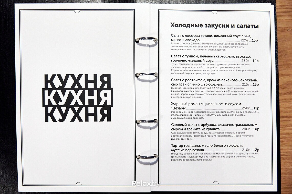 В меню присутствуют позиции европейской, американской, японской кухонь. Помимо говяжьих щечек, бургеров и суши можно выбрать итальянскую пасту, попробовать салат с арбузом или лососем татаки, побаловать себя тартаром или креветками темпура.