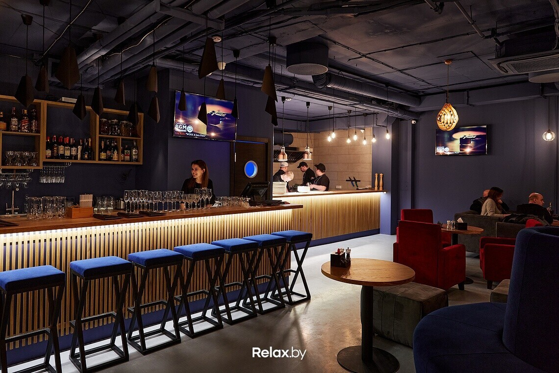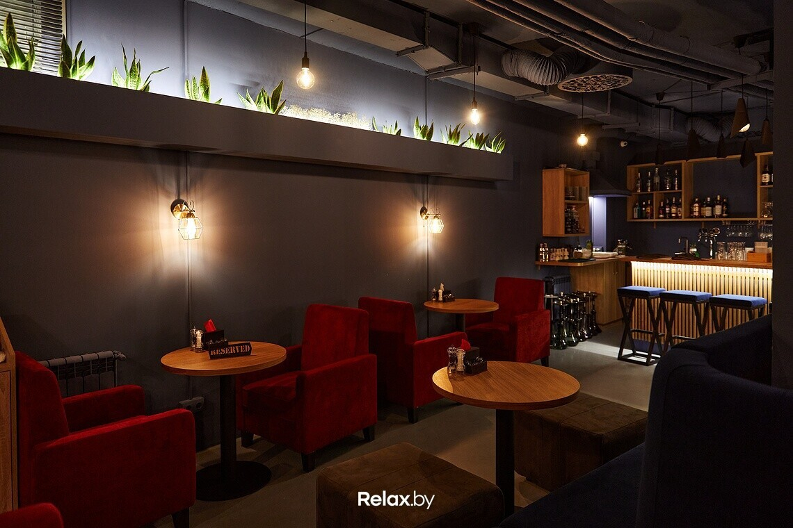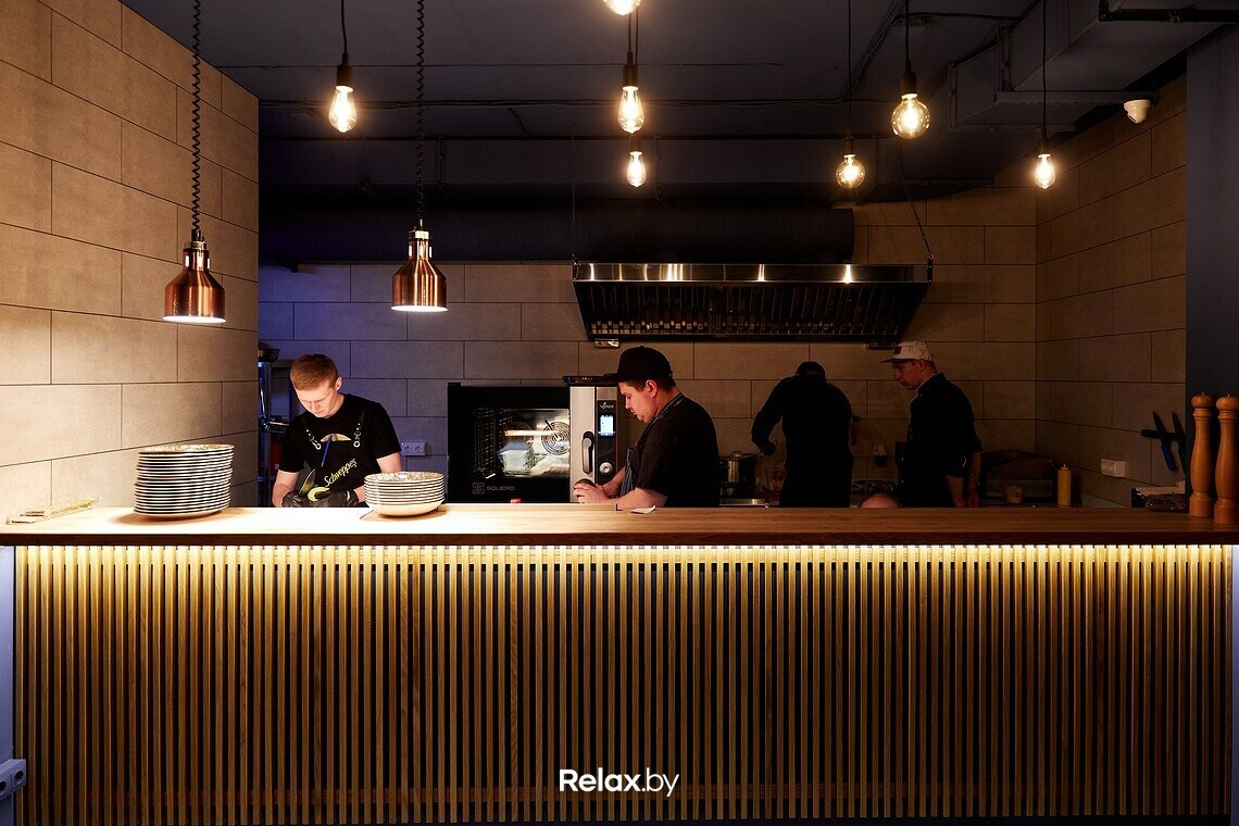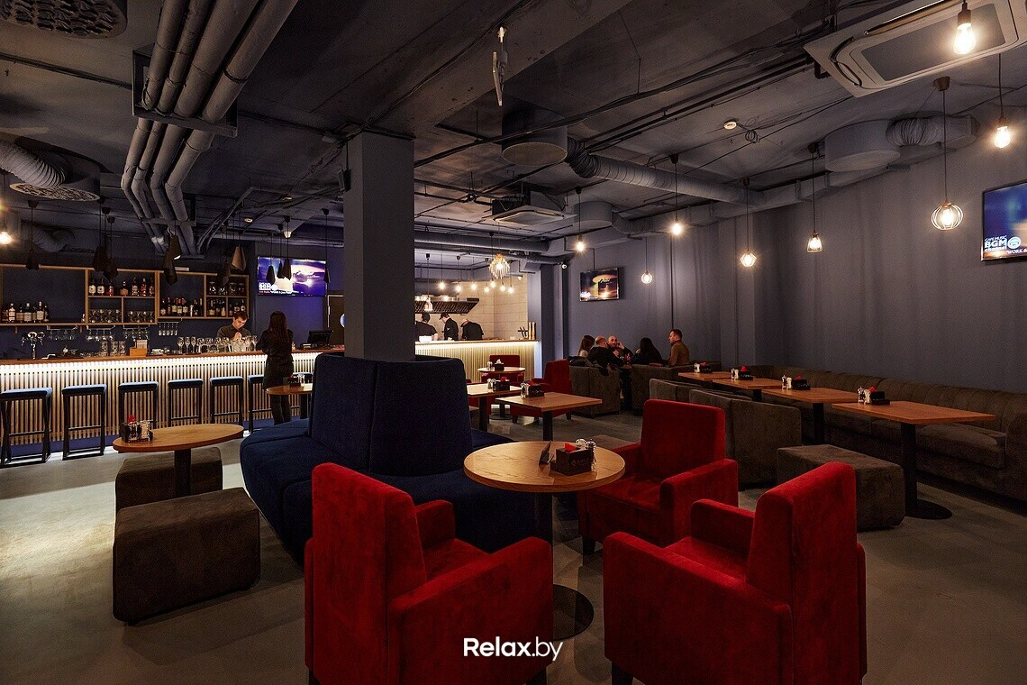 Бар оформлен в стиле комфортного лофта: характерные потолки и серые стены «уравновешиваются» мягкими креслами, диванами и теплым деревом. Рядом с баром — открытая кухня, напротив рабочей зоны — зал на пятьдесят посадочных мест.