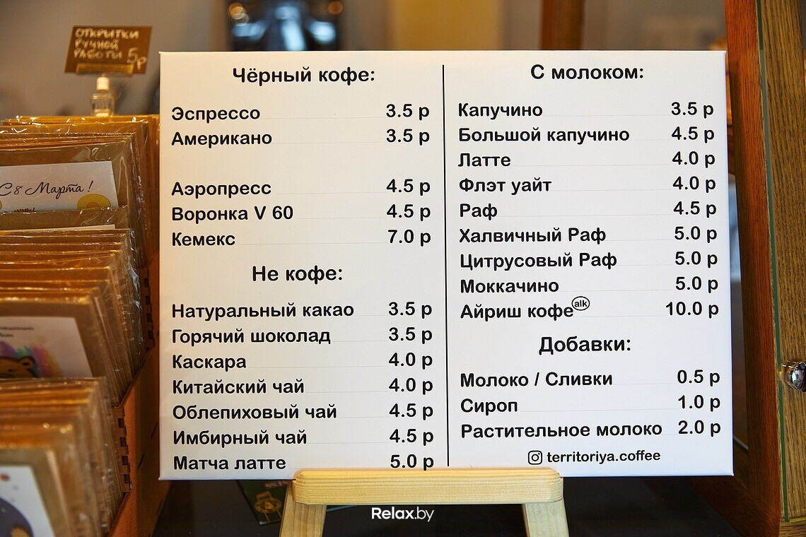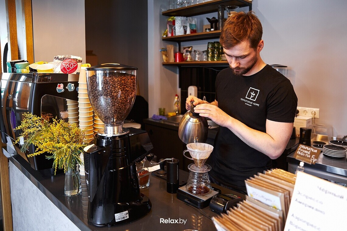 По зерну привязки к конкретному бренду нет — в «Территории кофе» работают с парой топовых минских обжарщиков: Single Step Coffee Co и Kitchen Coffee Roasters. Можно приобрести гостевой кофе российских обжарщиков, в частности бренда The Welder Catherine.
