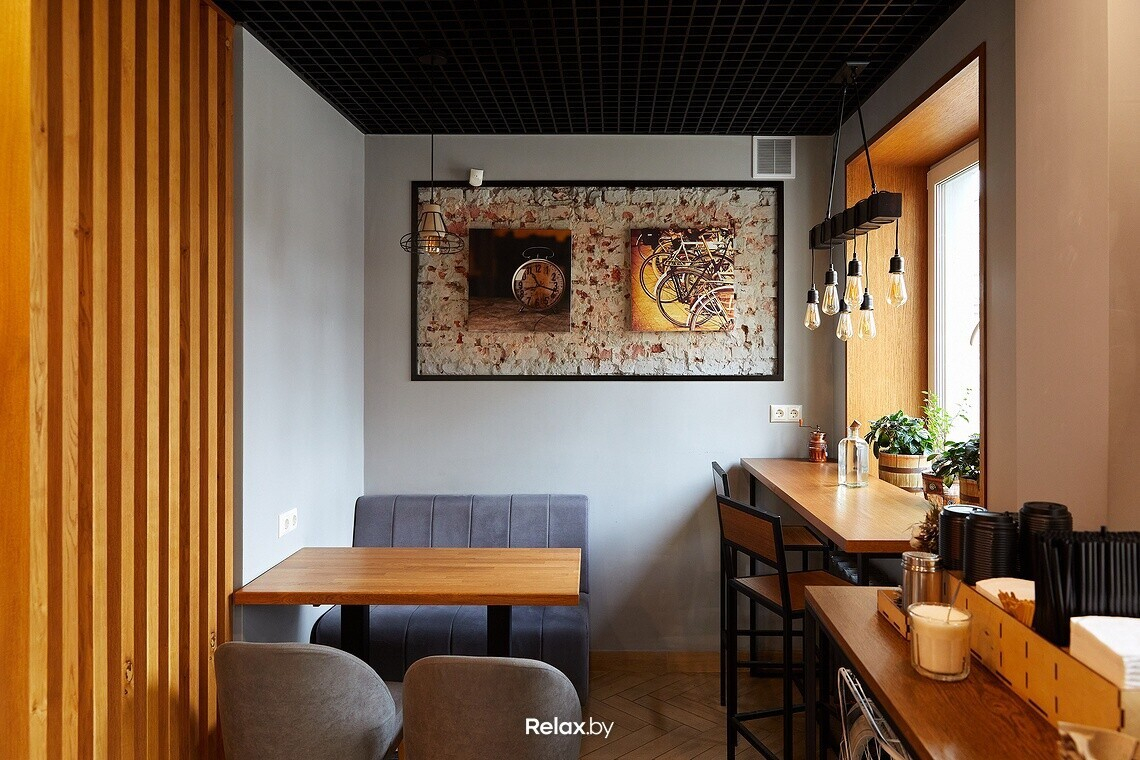 В зале кофейни 19 посадочных мест, есть зоны с высокой посадкой