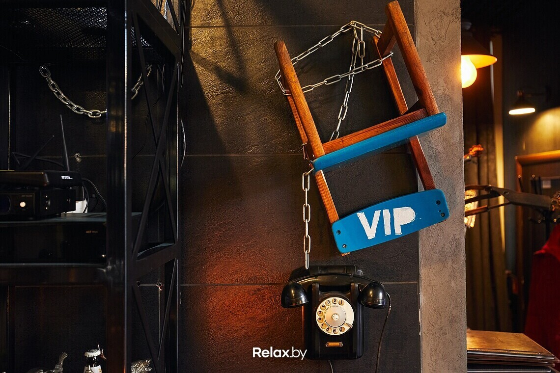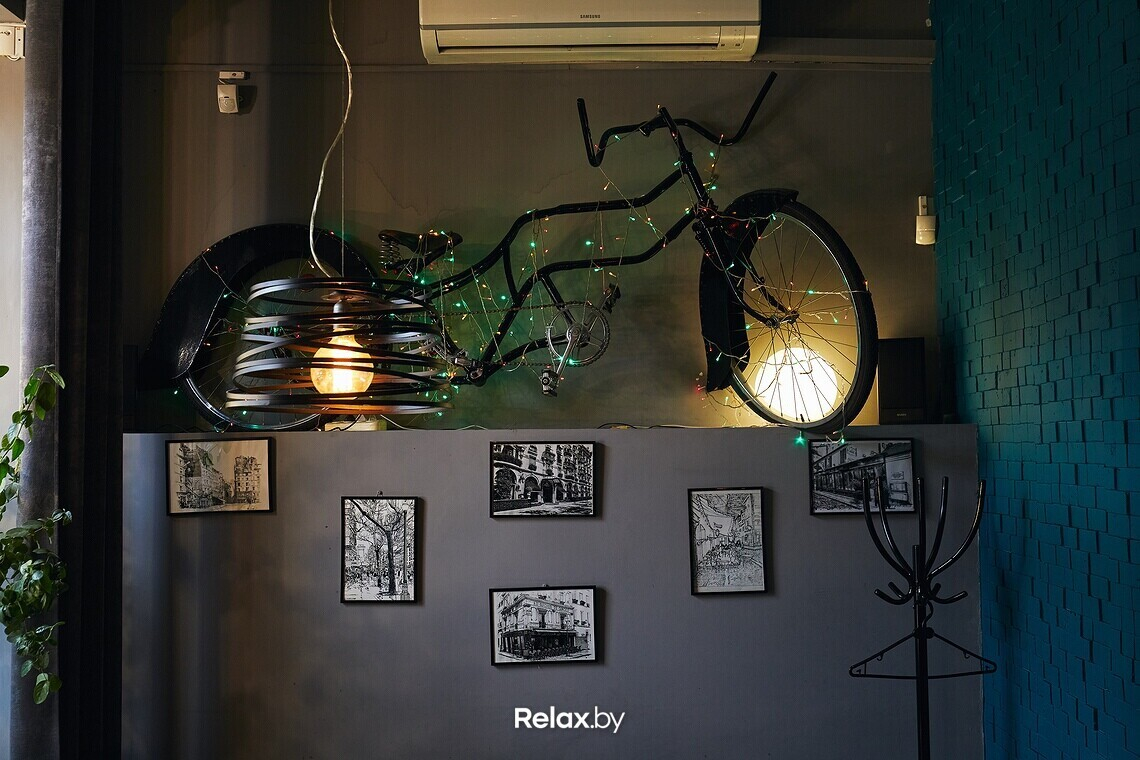 Интерьер в заведении немного шуточный: здесь есть такие интересные решения, как раритеты, перевернутые стулья, велосипед на стене и забавная фигурка на входе.