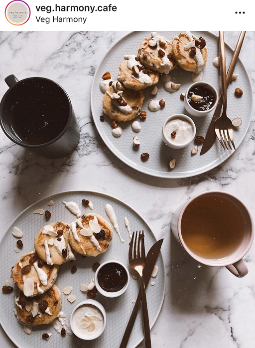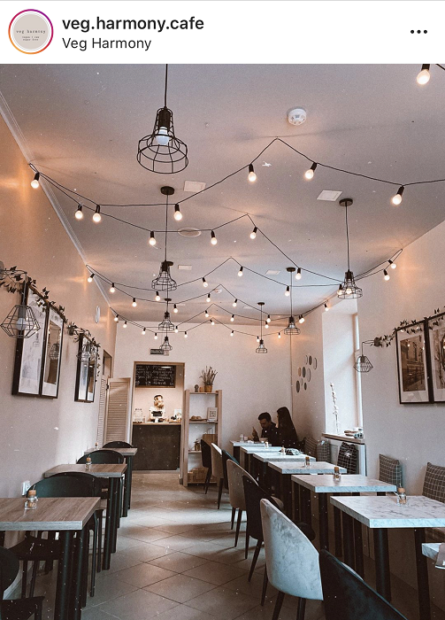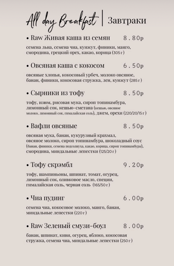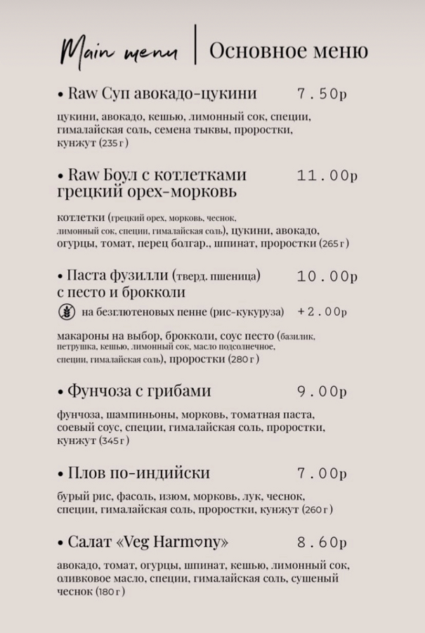 В светлом, наполненном светом зале, нет ни одного взрыва яркого цвета. Интерьер получился теплым, пастельным. Современный минимализм без излишнего декора. В меню — вегетарианско-веганско-сыроедческие блюда. Есть отдельное меню завтраков, в котором можно найти овсяные вафли или сырники из тофу. В основном меню найдете даже веганский борщ. Цены в меню не побоимся назвать демократичными, средний чек составит 15-20 рублей. Дороже среднего по городу здесь стоит разве что капучино, потому что готовится на растительном молоке.