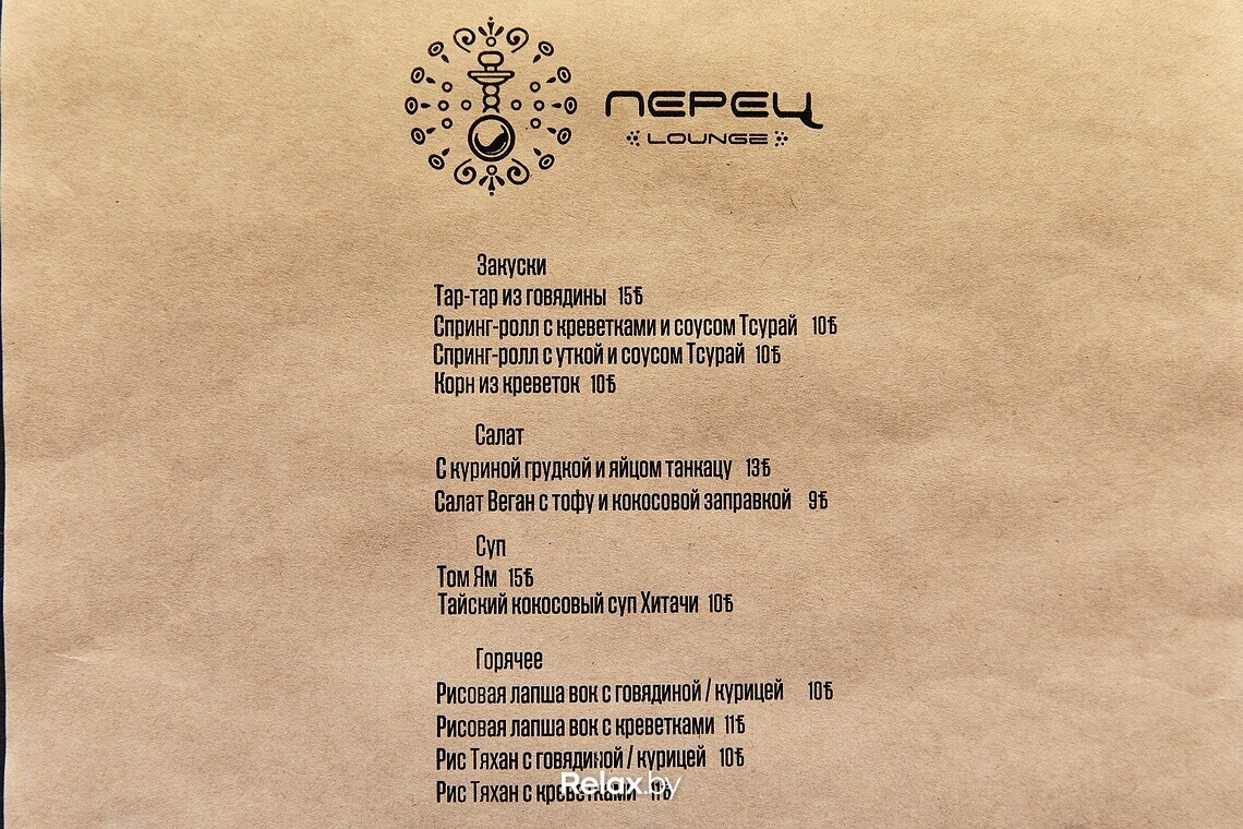 Самые сильные позиции в меню, по мнению директора, — том-ям, спринг-роллы, тартар и воки. Средний чек за вечер составит 35-50 рублей. Есть чайная карта, в которой представлено около 10 позиций. Для кальянов здесь используют премиальные табаки.