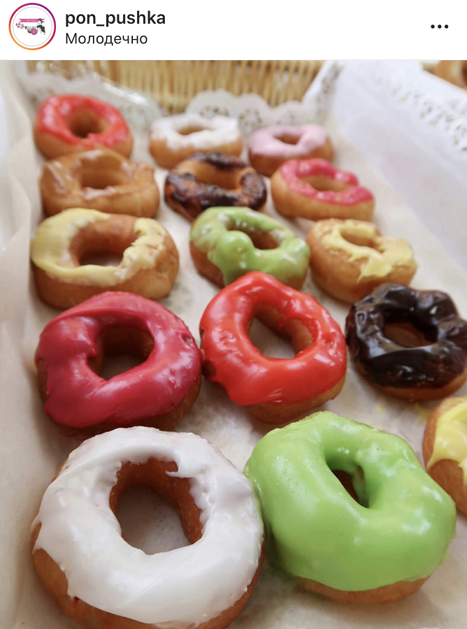 Пока сеть представлена в трех городах: Минск, Столбцы и Молодечно. На сайте указано, что есть возможность купить франшизу. В ассортименте 3 вида пончиков: классические (от 25 коп. за 1 шт.), напудренные (от 30 коп. за 1 шт.) и вкусовые (от 35 коп. за 1 шт.). Стоимость на витринах указывается за 100 г. Заказ подают в фирменной брендированной упаковке.