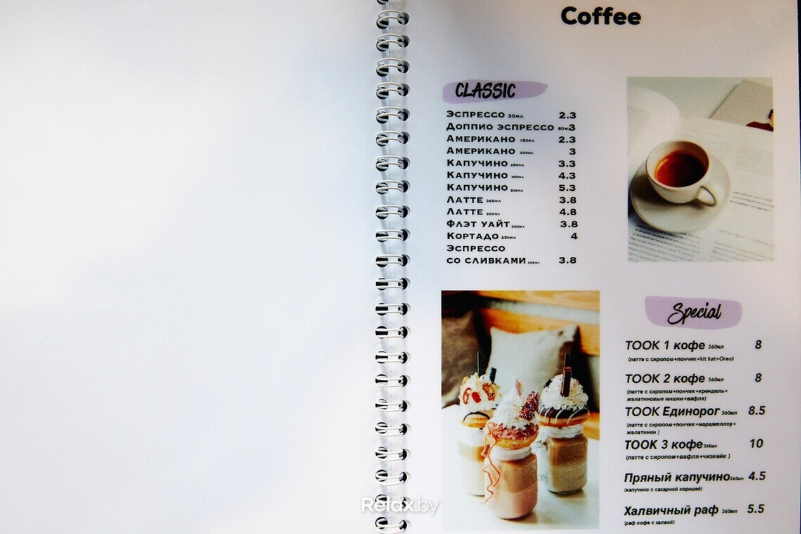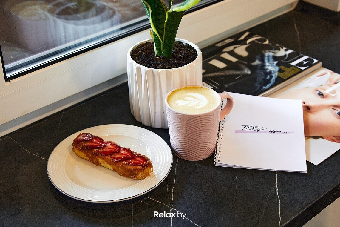 Ценник в зоне с кофе средний по городу. «Took Cafe» сотрудничает с обжарщиками Single Step Coffee Co. Десерты заказывают у BakeZavod и BonGenie, также на витрине можно найти продукцию собственного производства.