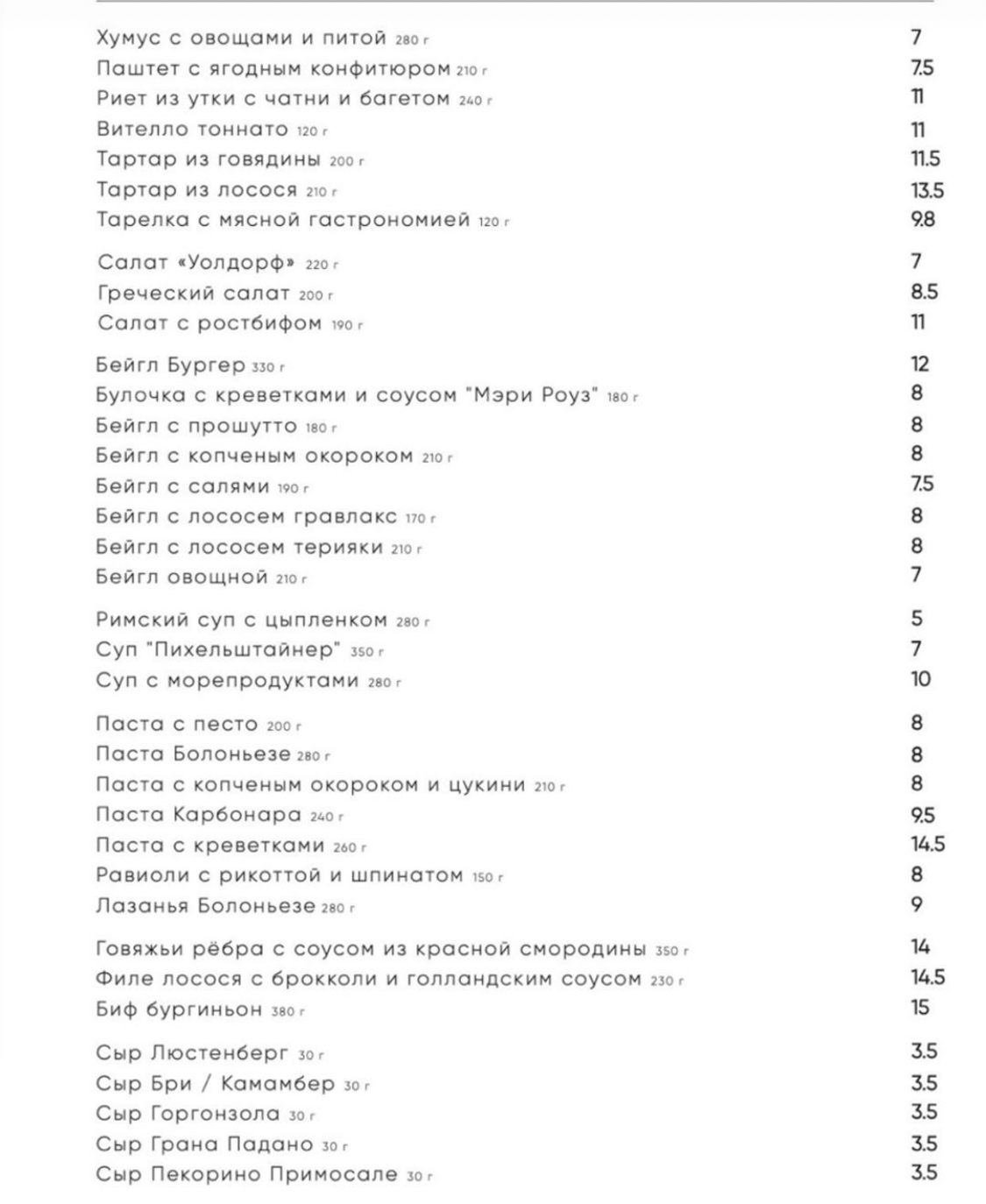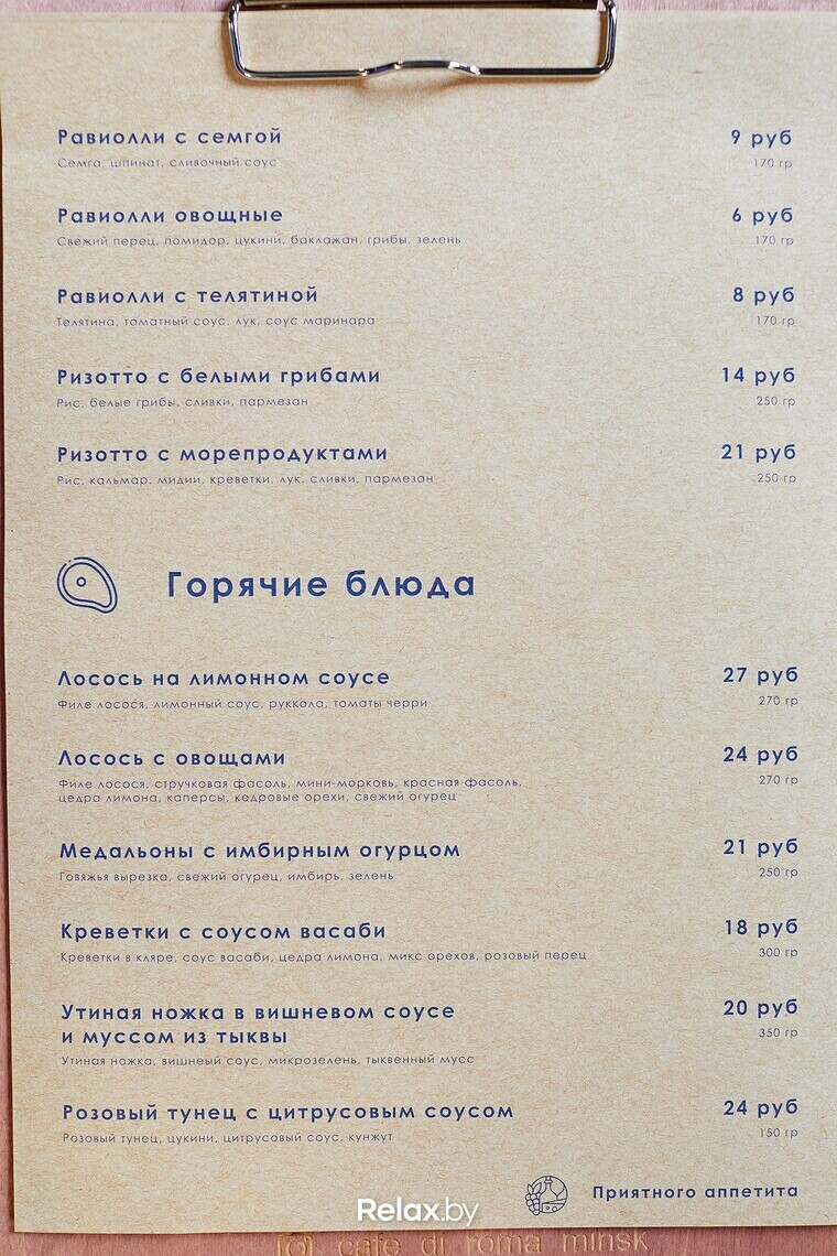 В меню упор сделан, безусловно, на хлеб и выпечку собственного производства. К вину можно собрать сырную тарелку или заказать прошутто. Вино подают, как по бокалам, так и с полки (пробковый сбор 9 р). Лаконичное основное меню получилось космополитичным: от «Греческого» салата до самодельных равиоли со шпинатом и рикоттой.