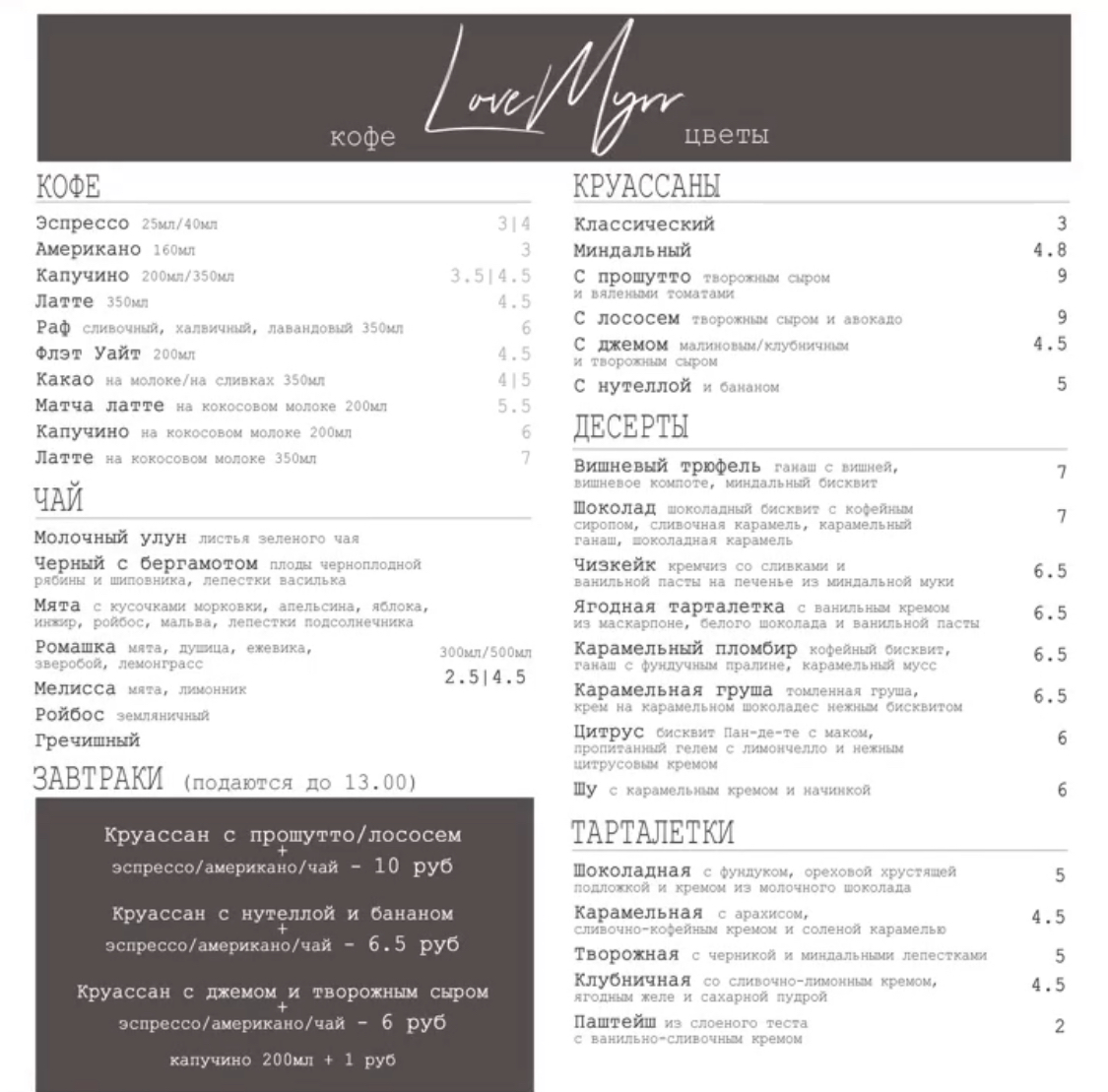 В меню несколько видов круассанов: от классического (3 р) до варианта с лососем, творожным сыром и авокадо (9 р). До 13:00 в LoveMyrr подают завтраки по фиксированной цене от 6 до 9 рублей. В стоимость входит круассан с начинкой по вкусу и напиток (эспрессо, американо или чай).