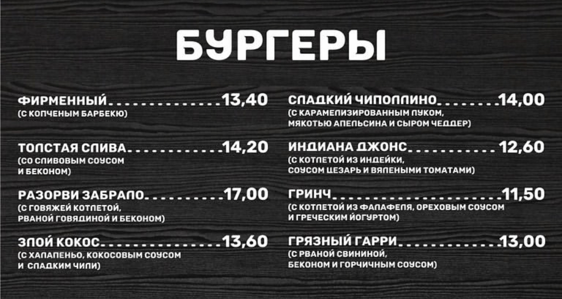 Небольшая бургерная в Новой Боровой возле магазина «Соседи»: можно взять еду навынос, а можно остаться на месте (есть посадочные места). К бургерам можно заказать картофель фри или салат. Цены на бургеры почти как в центре: от 12,60 рублей.