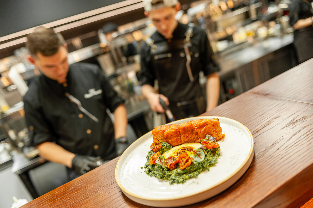 — Мы постарались выстроить большую картину личного взаимодействия кухни с гостем. То есть полное погружение в процесс создания блюда, которое будет подано на стол. При этом закрыли запросы разной аудитории: к нам можно прийти на завтрак или бизнес-ланч, а вечером поужинать в lounge-атмосфере под живой вокал.