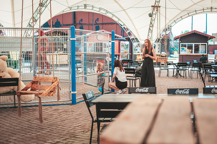 Итак, DВОР — это просторная локация с деревянными фуд-домиками, которая появилась еще зимой как европейская рождественская ярмарка «Aрт-Арена». Однако к лету тут делают кардинальный ребрендинг. Сейчас на площадке можно поиграть на уличном пианино, спряться под шатром в плохую погоду, покататься на деревянных качелях, посетить спортивные зоны или специальные локации для фото. Территорию DВОРа можно разделить на две зоны: фудкорт и чилаут-зона с напитками.