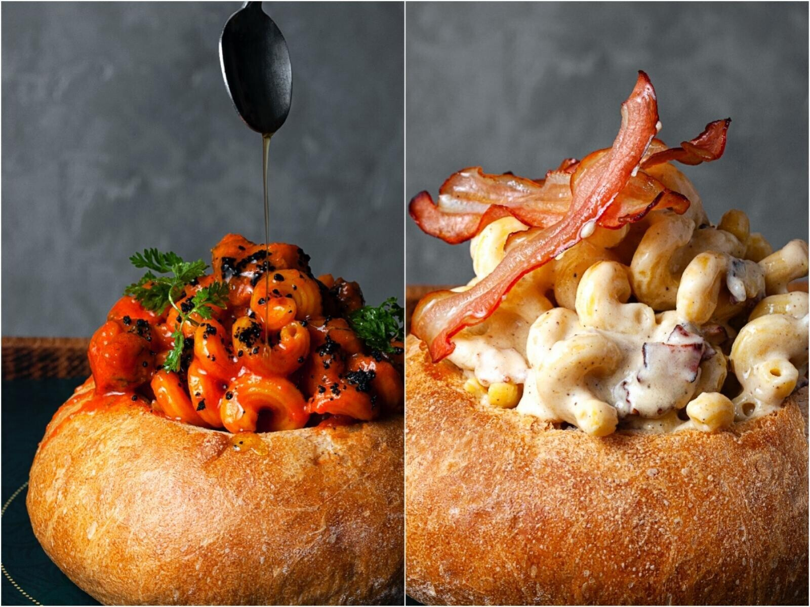 В белой пшеничной булочке будут подавать пасту с бурратой, морепродуктами, с четырьмя видами сыра, а также авторскую пасту с креветками и водкой. Также в хлебе предложат запеченные овощи со страчателлой, салат с креветками и рикоттой, супы и несколько видов горячих блюд. Обязательно попробуйте баклажаны-пармиджано, куриные бедра в меду и говяжьи ребра с овощами в соусе демигласс. Цены в меню формируются, покажем их чуть позже.