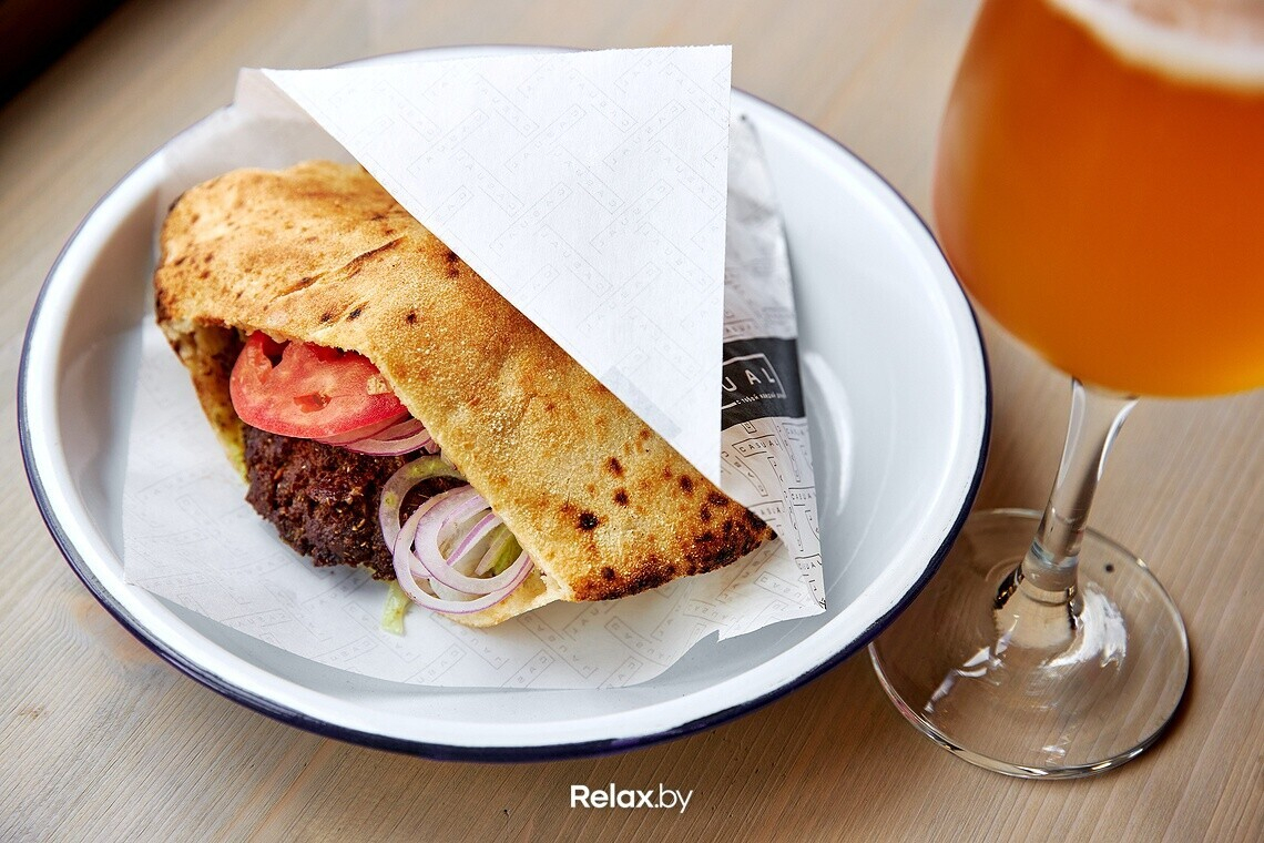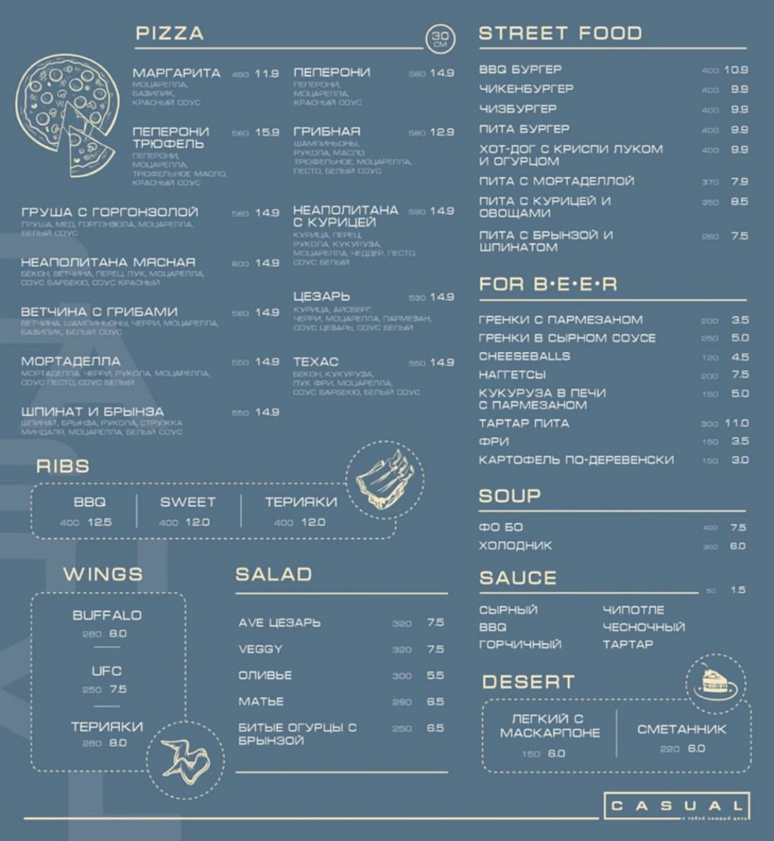 Помимо пиццы, в основе меню стритфуд, который составит гастрономическую пару пиву: в Casual это продукт из собственной пивоварни Taler. Также в меню найдете небанальную альтернативу бургеру: мясные и вегетарианские питы, которые получаются с дымком, потому выпекают их в дровяной печи.