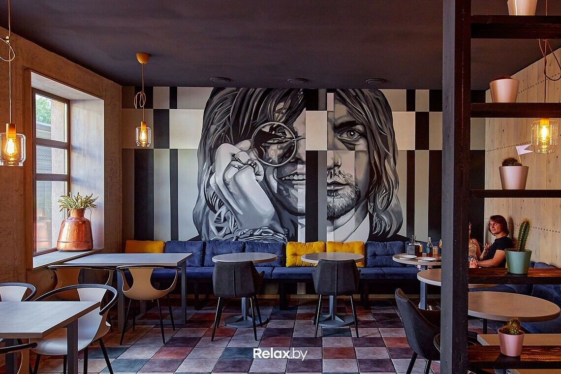 С порога понятно: дизайнер сделал ставку на монохром. Из ярких акцентов — вкрапления желтого цвета и реплики мирового стрит-арта на стенах. В залах много дерева, металла и естевенного света. Общая посадка превышает сотню гостей. Безусловно, не обошлось и без открытой кухни: любой желающий может наблюдать за приготовлением пиццы на дровах.
