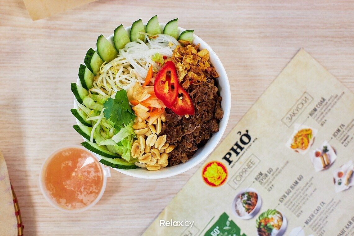 - Бун Бо Нам Бо (рисовая лапша Бун с говядиной, ростками бобов, свежим огурцом,перцем чили, зеленью и арахисом) — 13,9 руб.