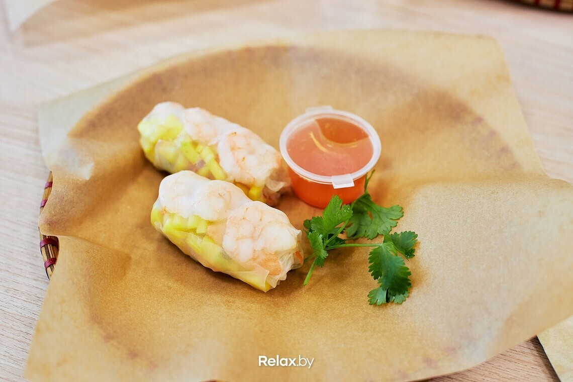 - Гой Том Га (спринг-ролл с креветками, манго, курицей, рисовой лапшой и овощами) — 6,9 руб. (1 штука)