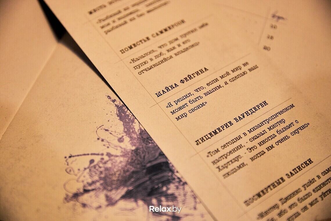 — Красной нитью стиль проходит и в меню: печатный шрифт, заметки «от руки» на страницах, характерная бумага, — перечисляет герой. — Названия наших авторских коктейлей также связаны с романами писателя.