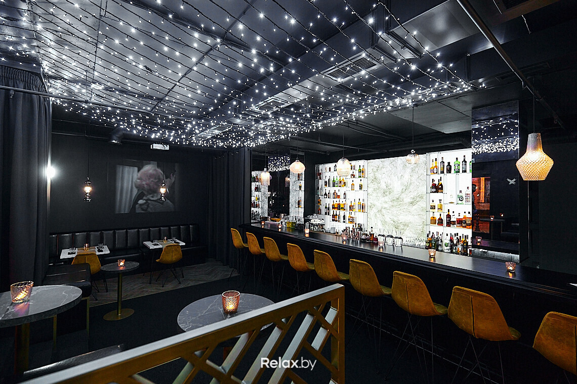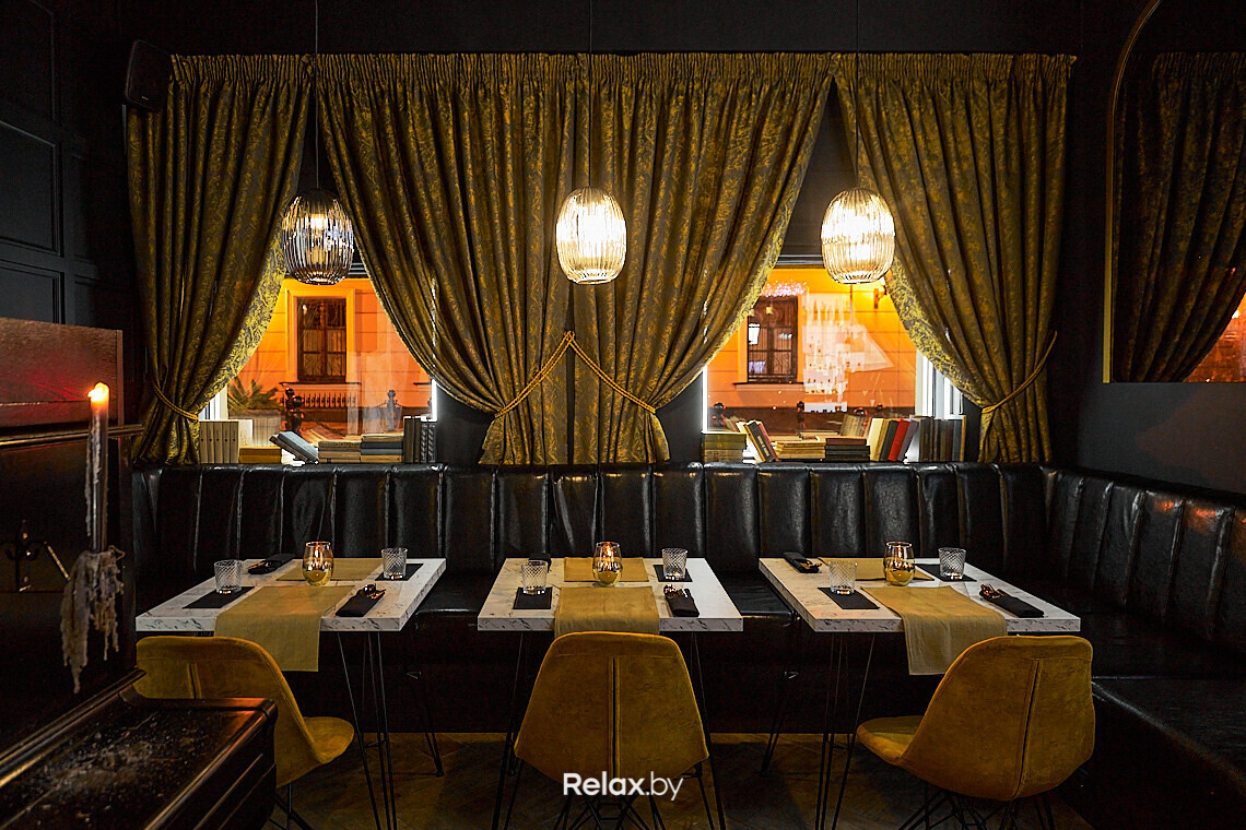 Основные тона — антрацитовый черный и латунь. Безусловная цветовая классика, которая при правильном подходе всегда выглядит благородно. Разбавили тандем цветов вкраплениями горчичного желтого и эффектными световыми панелями, напоминающими текстуру мрамора. Вечерами здесь зажигают свечи, что делает интерьер ламповым и смягчает настойчивый черный. В общем, после «Винного шкафа» здесь переделали решительно все, включая планировку. В частности, значительно удлинили барную стойку.
