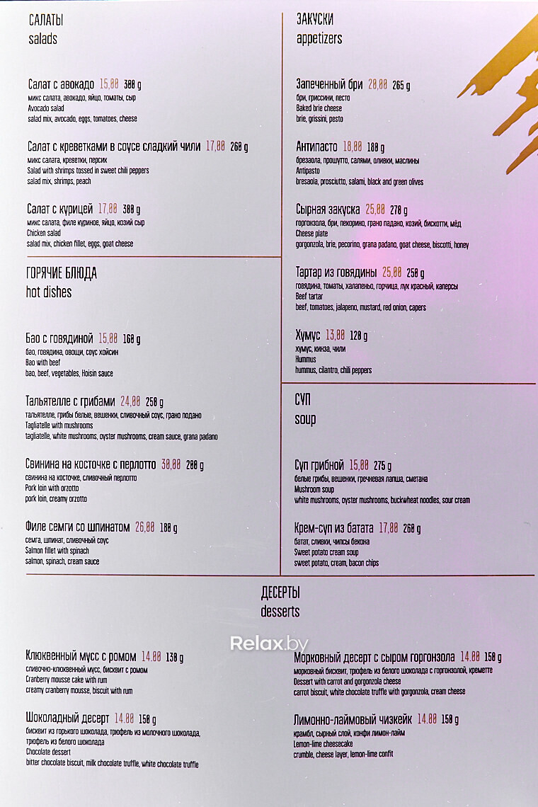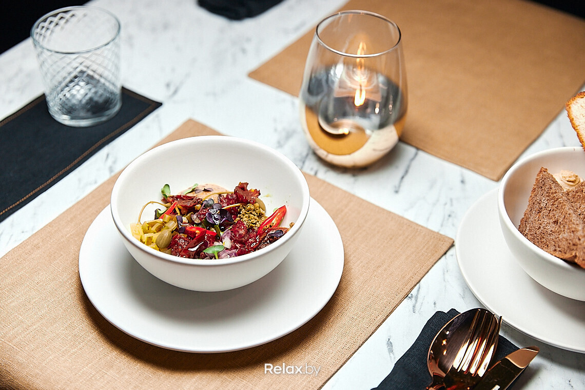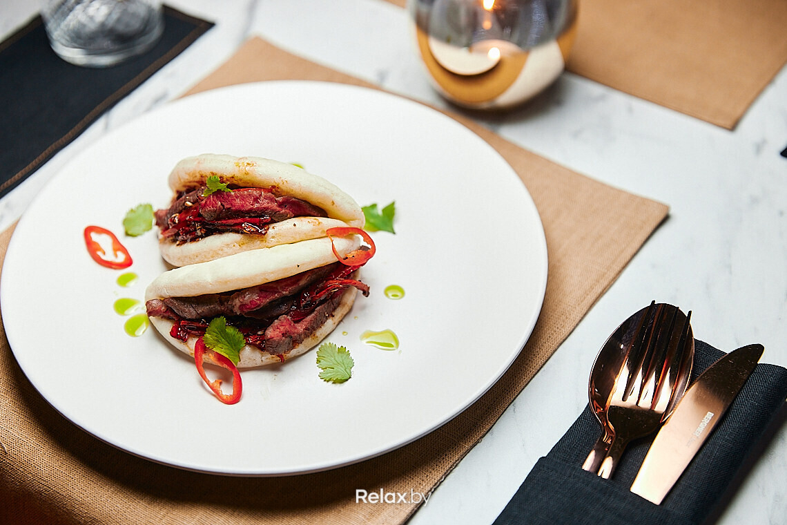 Совладелица подчеркивает, что заведение решило отойти от уже ставшей привычной «барной классики» в виде брускетт, сэндвичей и роллов. Поэтому в новом месте меню полного цикла: начиная от супов (кстати, есть любопытный вариант с бататом) и заканчивая бао и тальятелле. Кухня космополитичная, без уклона в какую-либо страну мира. Позаботилась шеф-повар Алена Кацубо и о вегетарианцах: в меню достаточно блюд без мяса.
