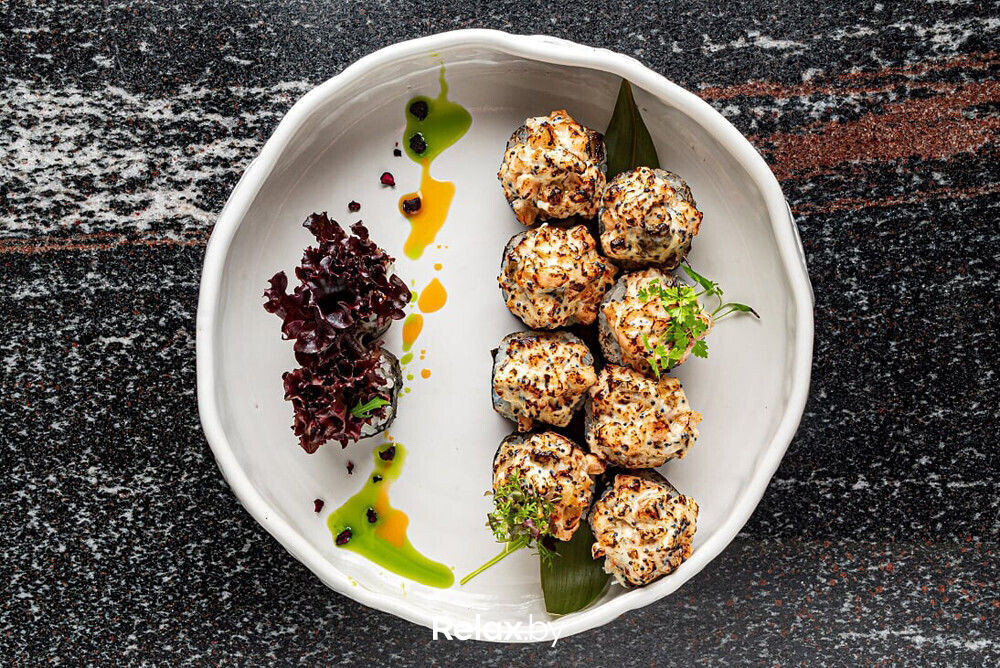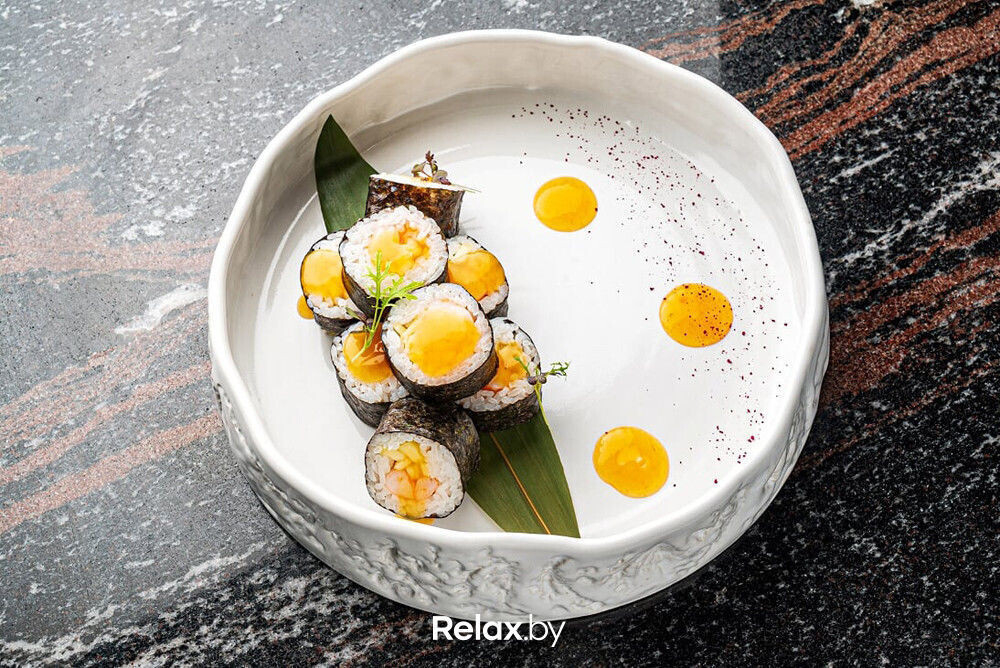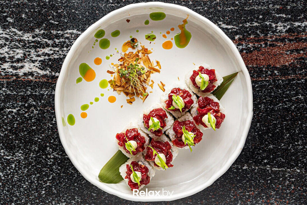 В Luxuria обещают меню полного цикла, за которое отвечает шеф-повар Дмитрий Новицкий. В тестовом режиме пока готовят только роллы, сашими и закуски. Притом есть весьма любопытные позиции: например, ролл с лососем, угрем, креветкой и сусальным золотом или ролл с тартаром из говядины, артишоками, сливочным сыром и трюфельным соусом.