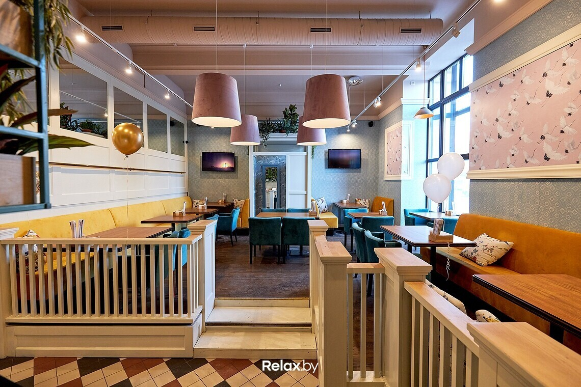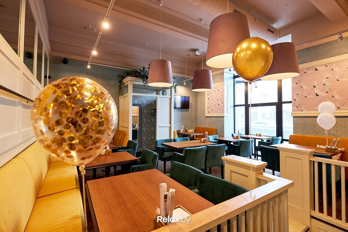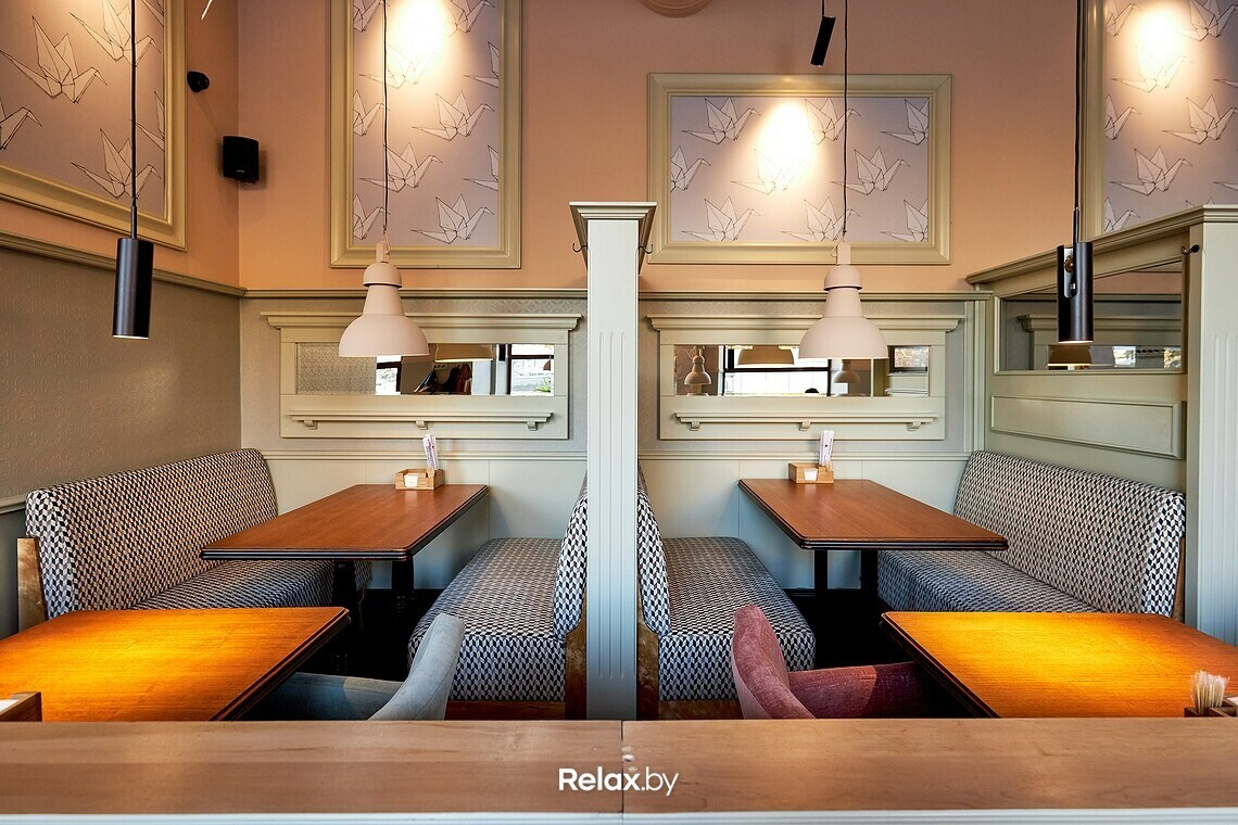 Цветовая гамма заведения — пастельные розовые и мятные тона — сразу привлекает внимание: в сочетании с азиатской тематикой она непривычна.