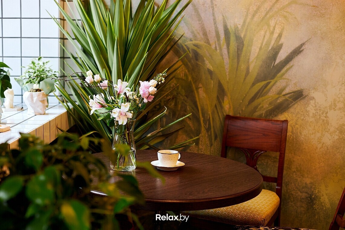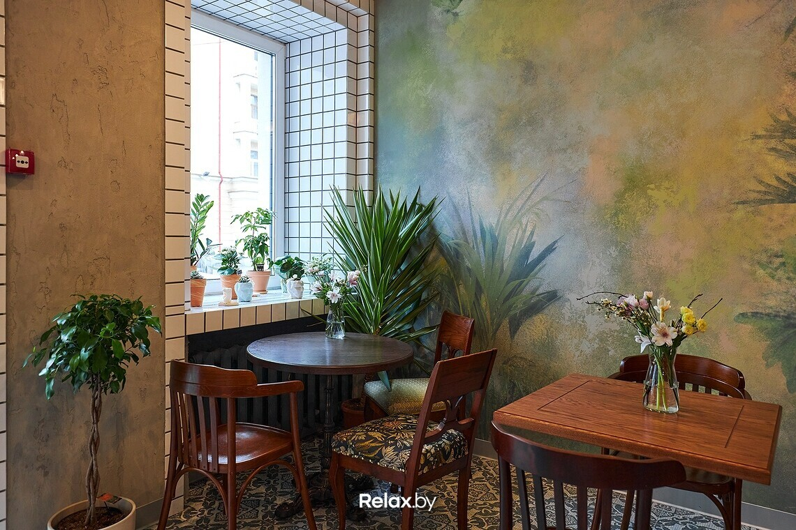 Отдельного внимания заслуживает интерьер. Как принято сейчас говорить, заведение получилось очень инстаграмным. Да и атмосфера обязывает: Kava i Kvetki расположились в доме 1895 года постройки, в зале до сих пор сохранилась часть дымохода с оригинальной кирпичной кладкой. Дизайн-проект разрабатывало дизайн-бюро Алены Булатой, известной по проектам «Пена дней», «Невыносимая легкость бытия», Brioche Bistro, Brioche Borovaya, кормящий бар «За Победой» и др. Получился комфортный колониальный стиль с акцентом на живую зелень и натуральные материалы. Зал хочется рассматривать: текстуры, плитка, обивка стульев, роспись стен.