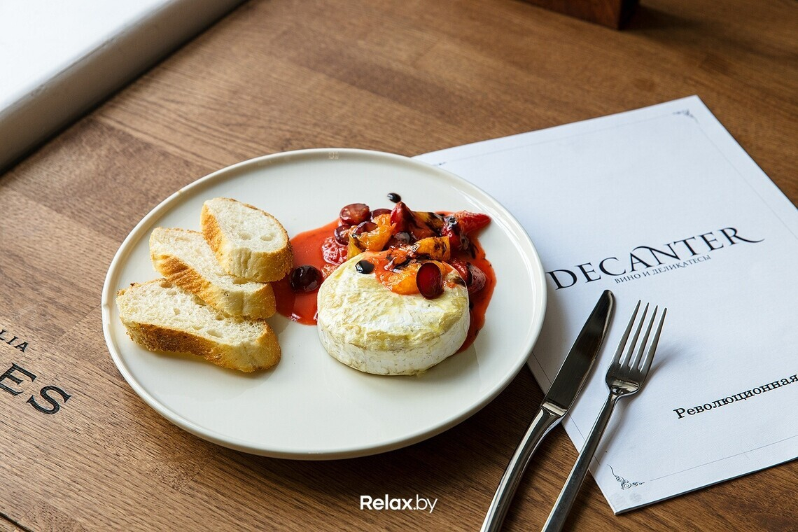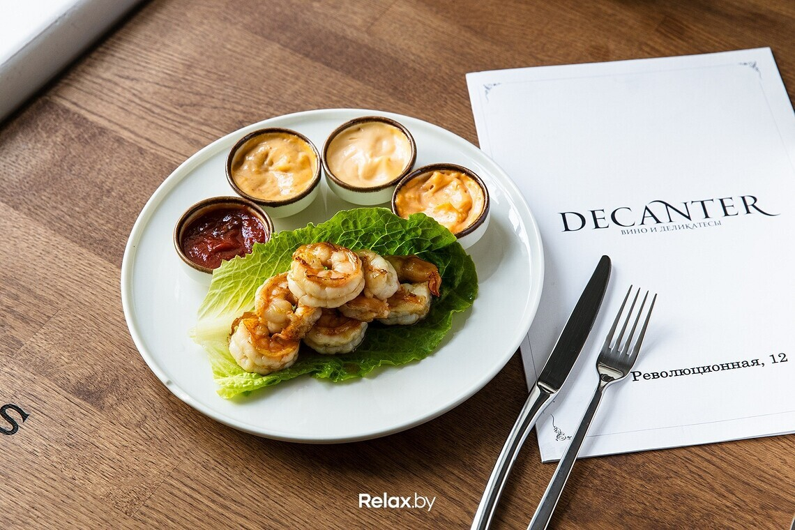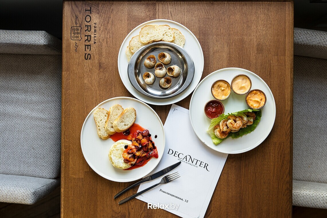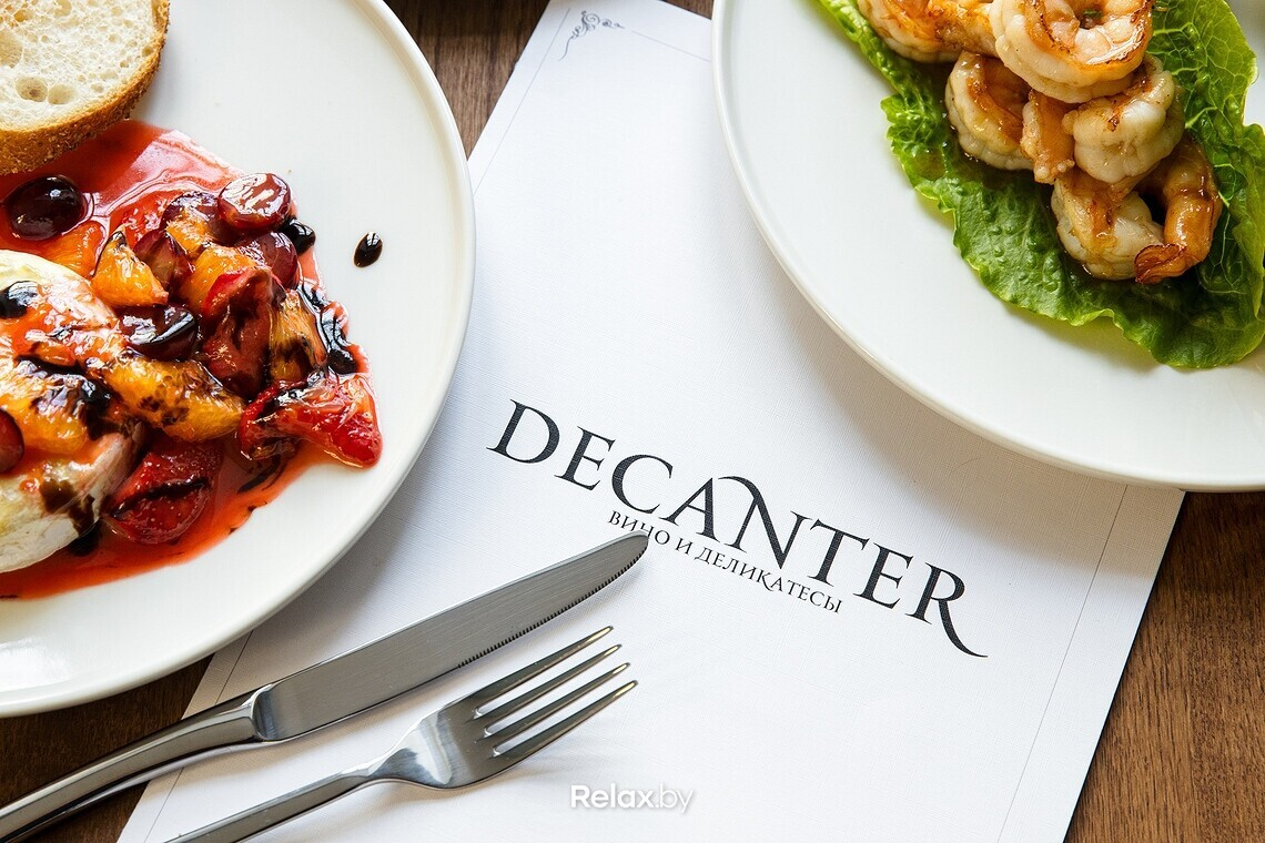 Меню Decanter выстраивается по принципу «самые популярные гастрономические пары к вину». Уклона в кухню той или иной страны мира точно не будет: ориентируется повар, в первую очередь, на качество продуктов. Из закусок можно заказать фуа-гра с тостами (12,5 руб.), улитки (12,5 руб.) или печеночный паштет с греческим хлебом (5,5 руб.). Есть выбор тапасов по 4,9 руб. и сетов на компанию от 15,5 руб.. В ближайшие дни в меню появятся дальневосточные устрицы. Напитки к еде можно приобрести с полки, а можно заказать побокально: сейчас в карте порядка 10-12 позиций. Те, кто алкоголь не употребляет, откроют для себя безалкогольные альтернативы.