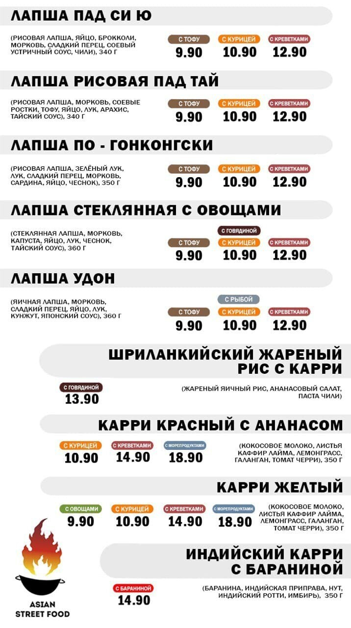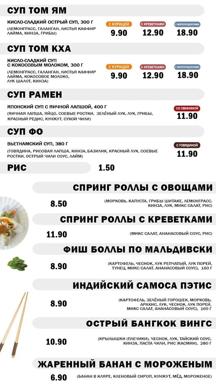 Сумуду убежден, что недорогой азиатский стритфуд — мировой гастрономический тренд, который добрался до самых дорогих мегаполисов, включая Лондон и Нью-Йорк. В Беларуси он только набирает обороты. В первую очередь шеф-повар рекомендует попробовать суп том-ям (с курицей, креветками или морепродуктами) и лапшу пад тай (с курицей, тофу или креветками). Средняя цена за блюдо — 9-12 рублей, выход порций — около 350 г. Вот несколько позиций из меню.