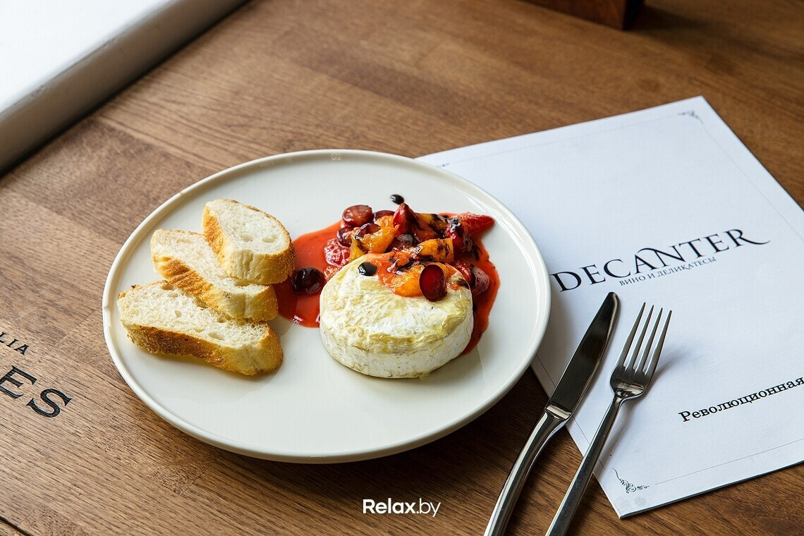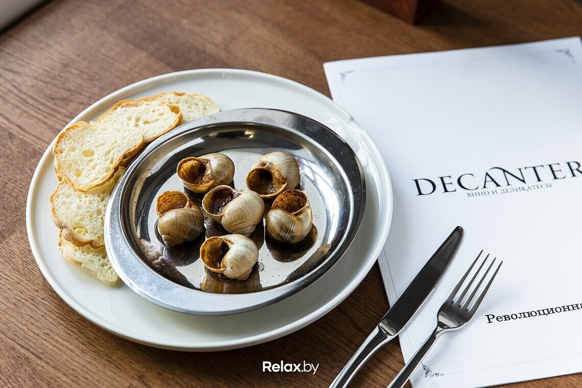 Меню Decanter выстраивается по принципу «самые популярные гастрономические пары к вину». Из закусок можно заказать фуа-гра с тостами (12,5 руб.), улитки (12,5 руб.) или печеночный паштет с греческим хлебом (5,5 руб.). Есть выбор тапасов по 4,9 руб. и сетов на компанию от 15,5 руб. Напитки к еде можно приобрести с полки, а можно заказать побокально: сейчас в карте порядка 10-12 позиций. Те, кто алкоголь не употребляет, откроют для себя безалкогольные альтернативы.
