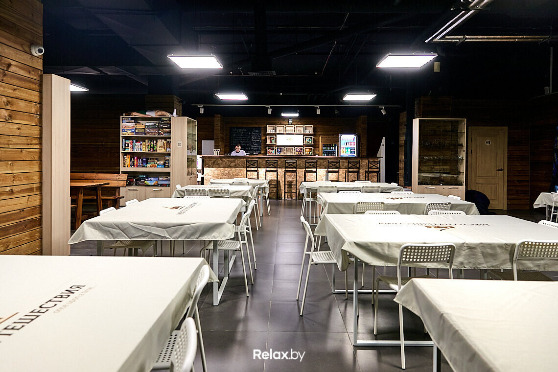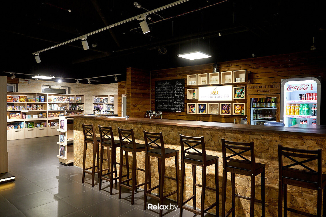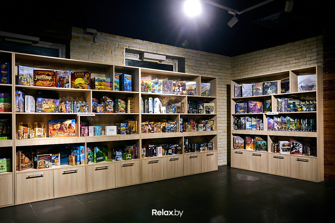 Новое место объединяет в себе бар, магазин и игровую зону. Просторное помещение можно разделить на две зоны. Первая — магазин настолок, который вас встречает сразу на входе. В нем 500-700 товаров: настольные игры, аксессуары, игровые фигуры и миниатюры. Цены на игры — от 20 до 450 рублей. Вторая — непосредственно пространство со столиками и стульями, где можно расположиться и поиграть. Рядом стоит шкаф с играми, в котором порядка 70 позиций: от известных «Монополии», «Манчкина», «Башни», Alias до более сложных вроде «Гарри Поттера», «Места преступления» и др. Зона игр платная, вход — 10 рублей за весь день.