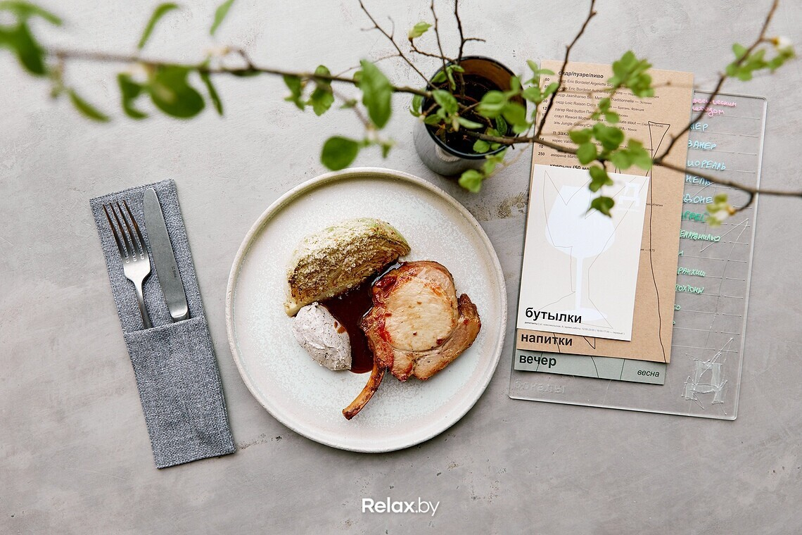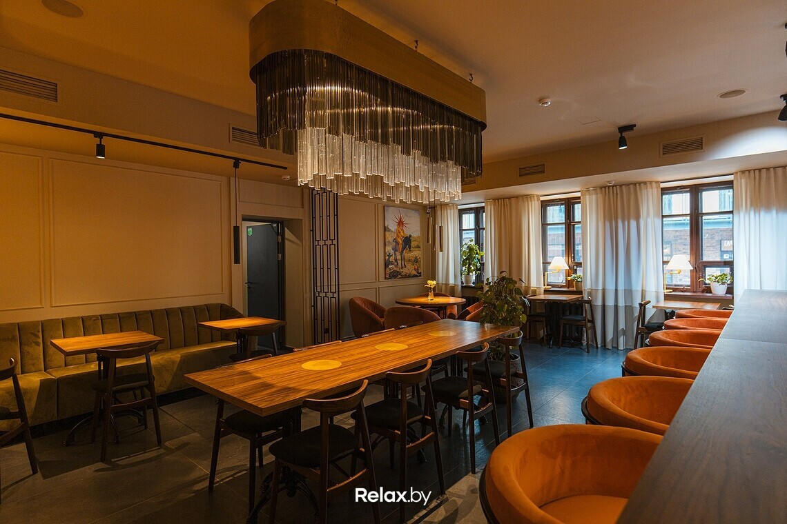 Меню для нового места ставил Евгений Журбенко, шеф-повар Rose Gose. Одна из первых особенностей кухни — поздние завтраки, которые подают аж до 16.00. В остальном в заведении современная смешанная кухня: европейская и паназиатская. Задумка в том, чтобы в меню было представлено порядка 70% закусок и 30% горячих блюд. Отдельно выделили raw bar: можно попробовать тартар из лосося, говядины, ягненка и даже копченого угря. Что касается горячих блюд, то они проходят обработку на углях: на кухне используют японскую печь Kamado.