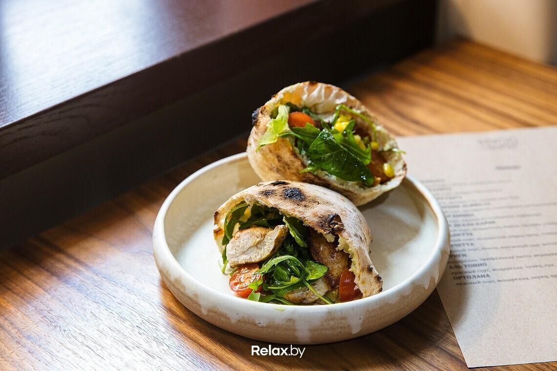 Дровяную печь для пиццы в заведении установить возможности не было, зато на кухне есть хоспер — печь-гриль, в которой можно коптить, жарить, как барбекю, все на натуральном угле. Цена пиццы варьируется от 8 до 20 руб. в зависимости от состава. Кстати, ее можно взять навынос. Пита с курицей, кукурузой, черри и сырным соусом обойдется в 15 руб. Тартар из говядины — 15 руб. Представлены две позиции супов: чили кон карне стоит 16 руб., крем-суп из шампиньонов — 11 руб. Из основных блюд можно выделить телячьи щеки со сливочным булгуром и пармезаном за 21 руб., а также стейк с пряной тыквой за 35 руб.