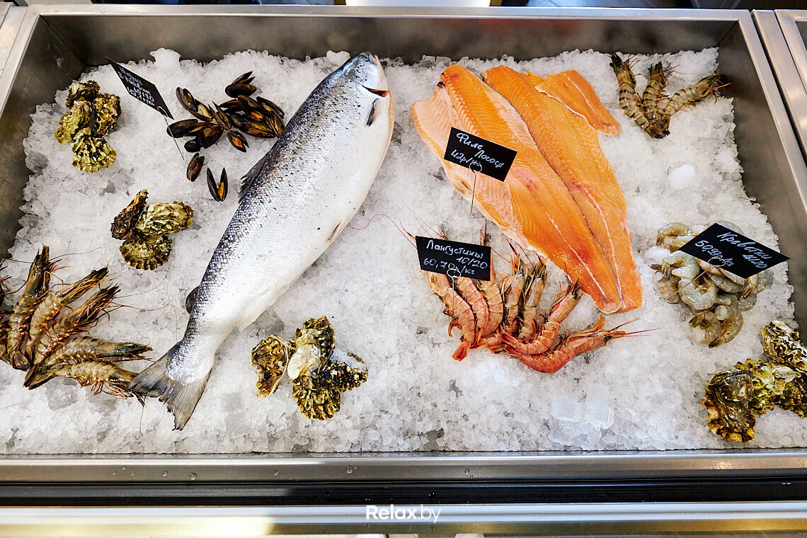 Команда решила попробовать себя в новой нише, а формат «поесть и закупиться» посчитали наиболее актуальным: так появился тандем магазина и бистро. На специальной охлажденной витрине — обилие морепродуктов: устрицы, осьминоги, филе лосося, лангустины и др. Купить килограмм филе лосося предлагают за 42 руб. за кг, лангустины — 60 руб., осьминог — 54 руб. Помимо этого, есть витрины с замороженными продуктами. Например, килограмм очищенных креветок обойдется в 35-40 руб., медальоны из тунца — 26 руб., зеленые мидии — 35 руб., мидии раковинные — 14 руб и др. Те продукты, которые видите на витринах маркета, можно попросить приготовить по специальным рецептам. А затем расположиться в зале и попробовать блюда.