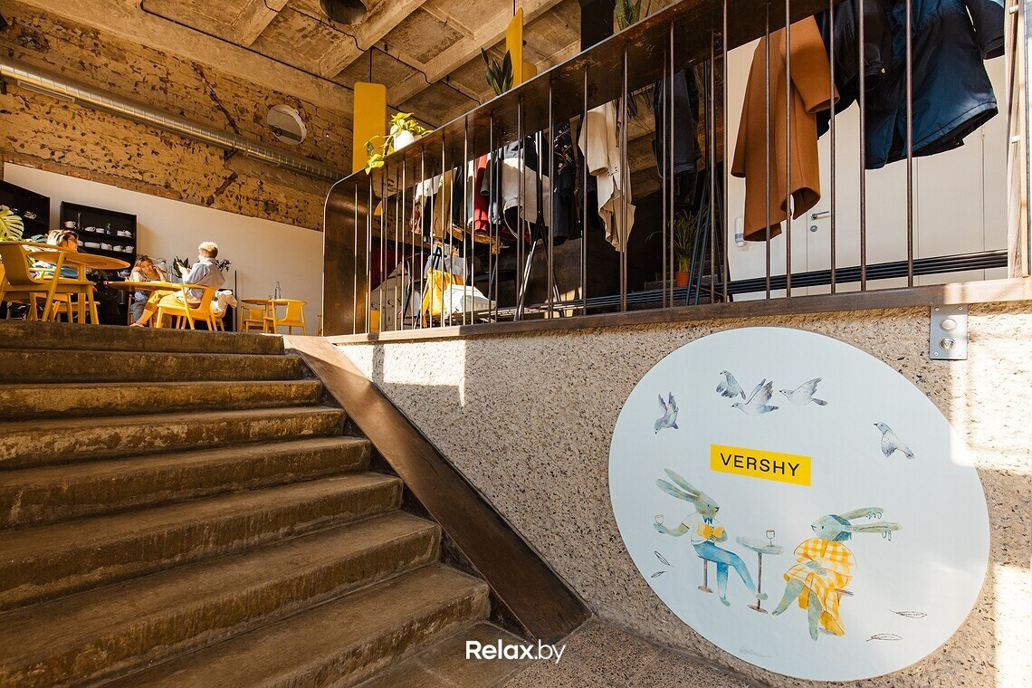Заведение расположилось, можно сказать, в намоленном месте — в помещении бывшего бара «Ў», ставшего для Минска культовым. Осенью 2020-го и бар, и галерея «Ў» закрылись. «Вершы» переехали сюда в феврале и открылись уже через два месяца. В интерьере из стилистических изменений, которые сразу бросаются в глаза, — ярко-желтые стулья и столики, аккуратные черные полки с посудой, а также белые панели на стенах. Оформлением занимался директор студии дизайна Soffit Interiors Феликс Дзеранов.